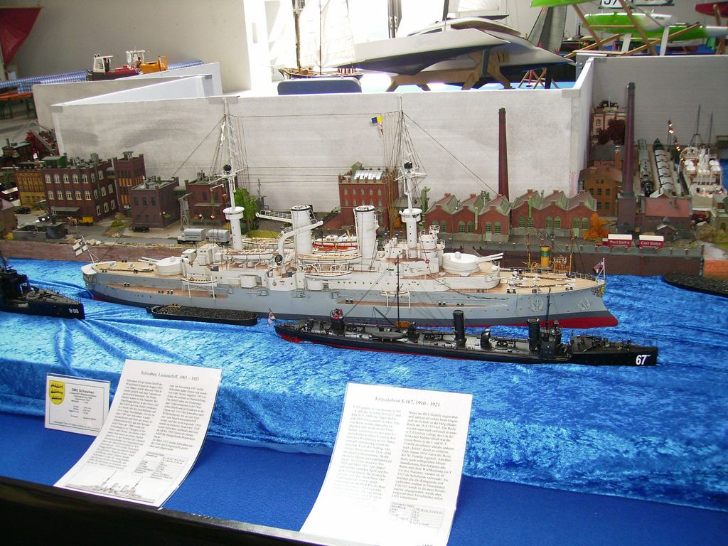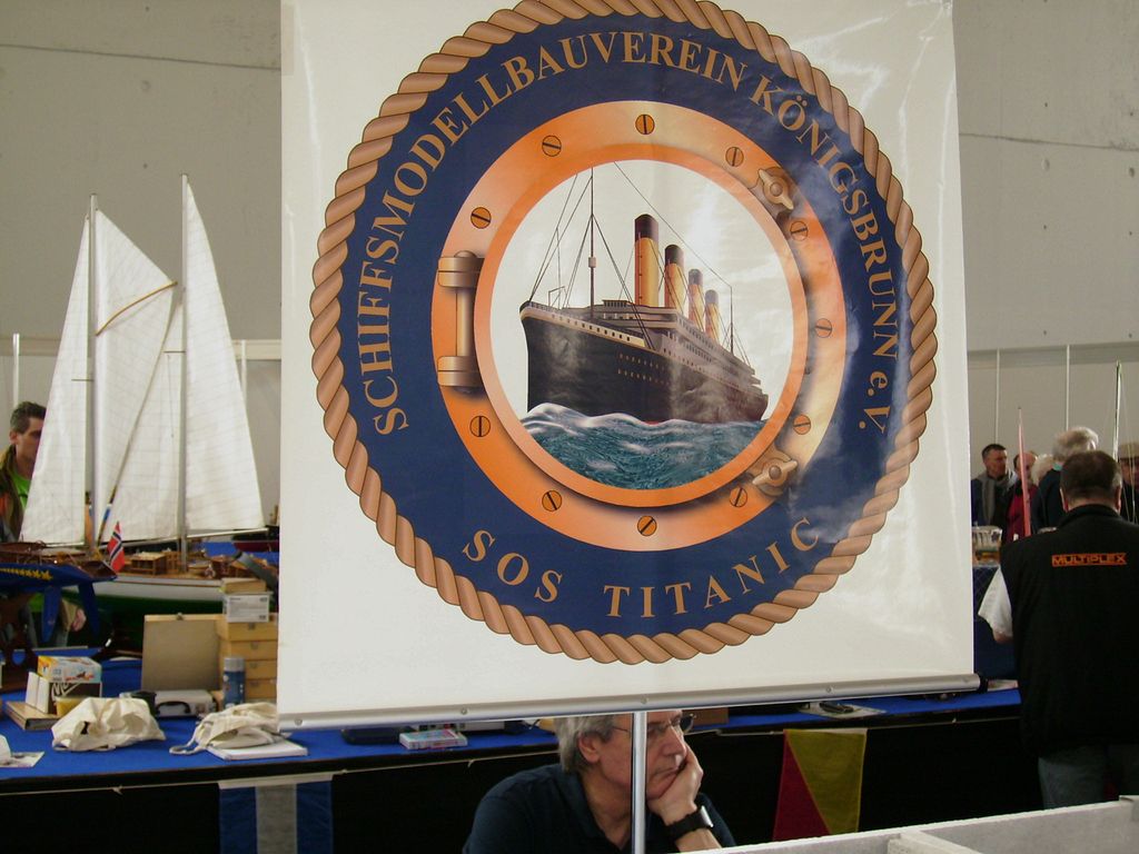 Kolem bazénu bylo asi 8 německých lodně-modelářských klubů, nafotil jsem si jejich „Badge“ (zrovna mě nenapadá jiné slovo). Jedna parta byli Angličani, ale jejich lodě byly podivně vybaveny šrouby a hřídeli, protože místo vedle sebe byly šikmo nad sebou a bez opěr. Zdá se, že tohle je nijak nebralo, i když lodě byly jinak docela hezké. Podívejte se na obrázcích. Tohle je parta, kterou jsem vídal už i v Sinsheimu. Asi mají s kamarády v Německu freundschaft a jezdí k nim vystavovat.