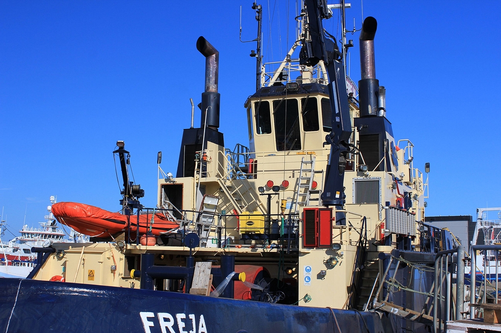 Procházel jsem molo a zahlédl další krásnou loď - remorkér Freja (IMO 9175262). Odvážil jsem se i do prostor, kde na vratech byla cedule, ze které bylo patrno, že je vstup zakázaný. Ale když vrata byla otevřená a za nimi zajímavé věci... Měl jsem s sebou teleobjektiv, takže jsem jej využíval. Byla neděle a nikde nikdo. Nevím, jak by to dopadlo, kdyby byl všední den a v loděnicích se pracovalo. Buď bych byl vykázán, nebo bych možná měl příležitost vidět více. Určitě by mi lákal remorkér Freja, byl opravdu zajímavý.