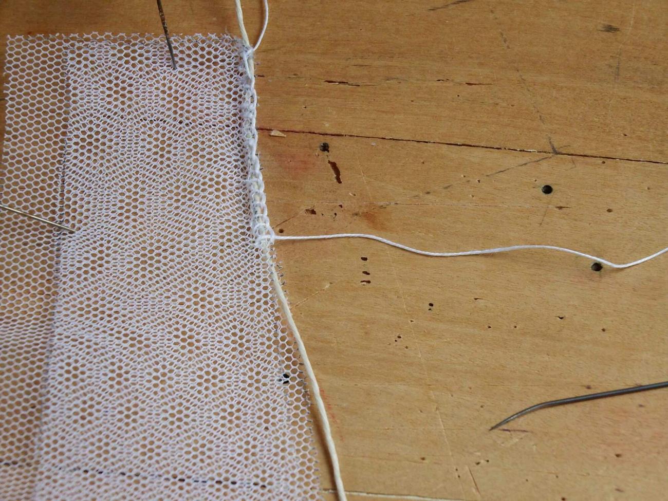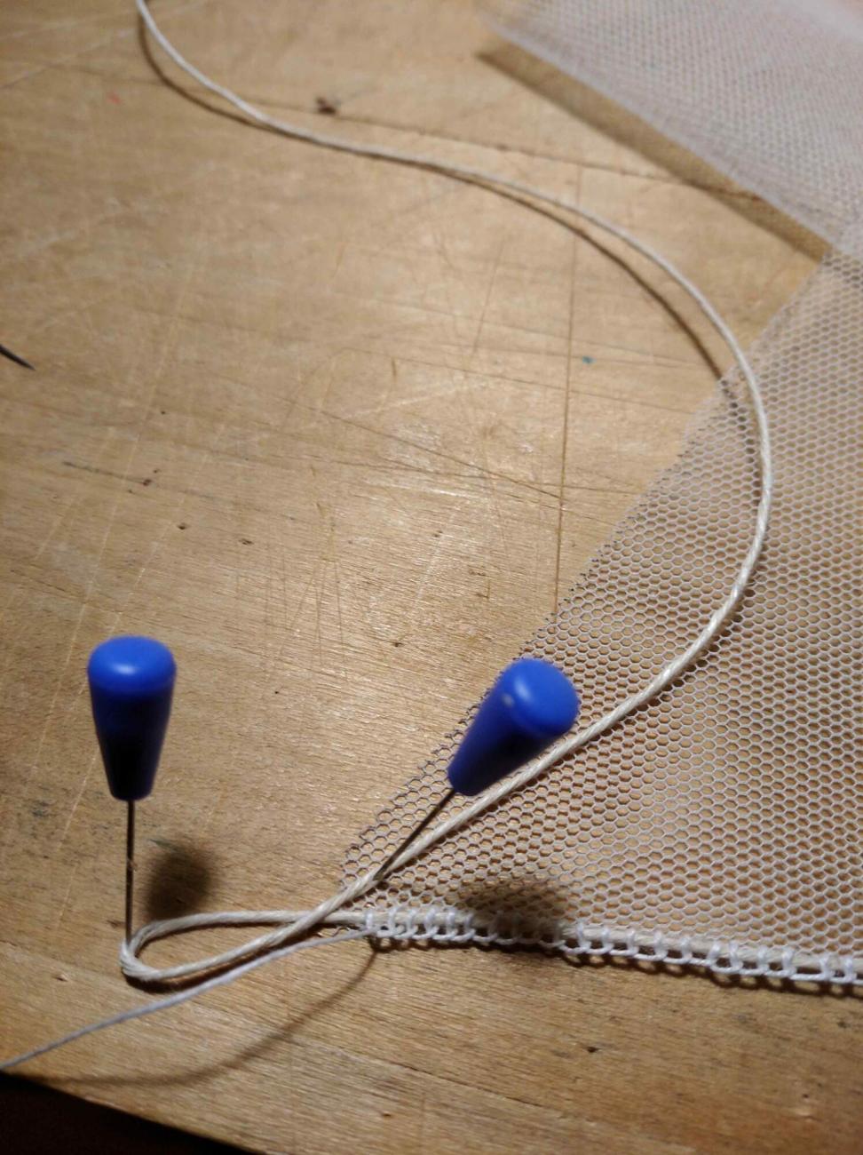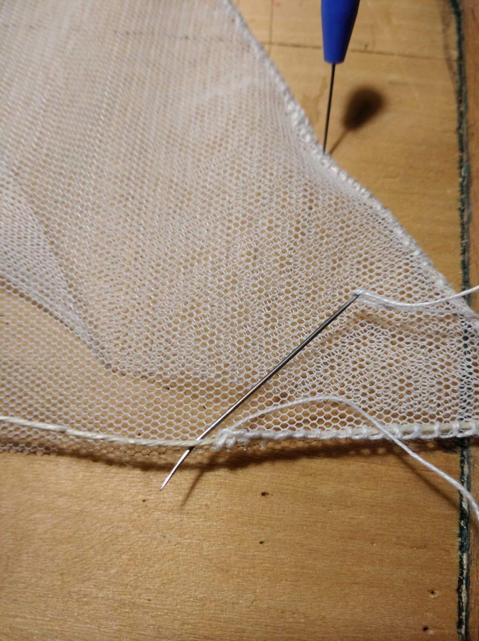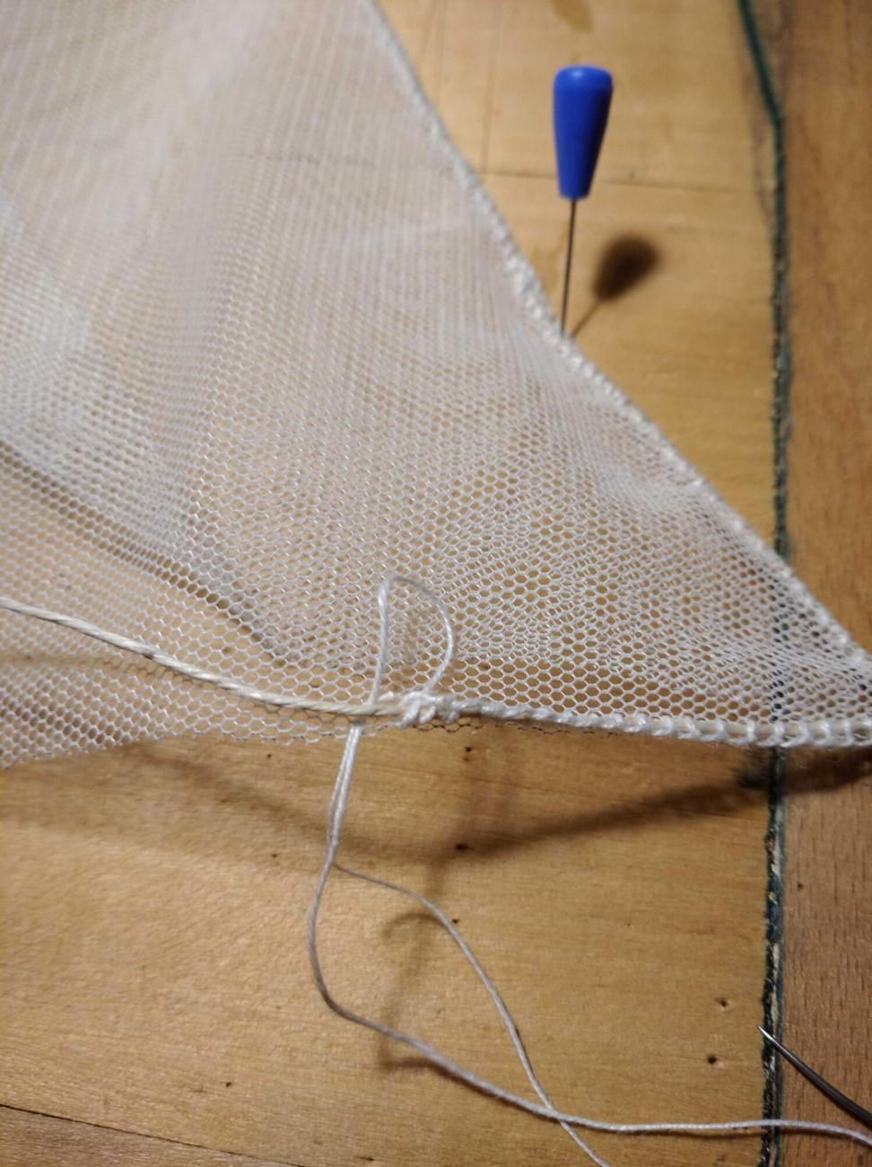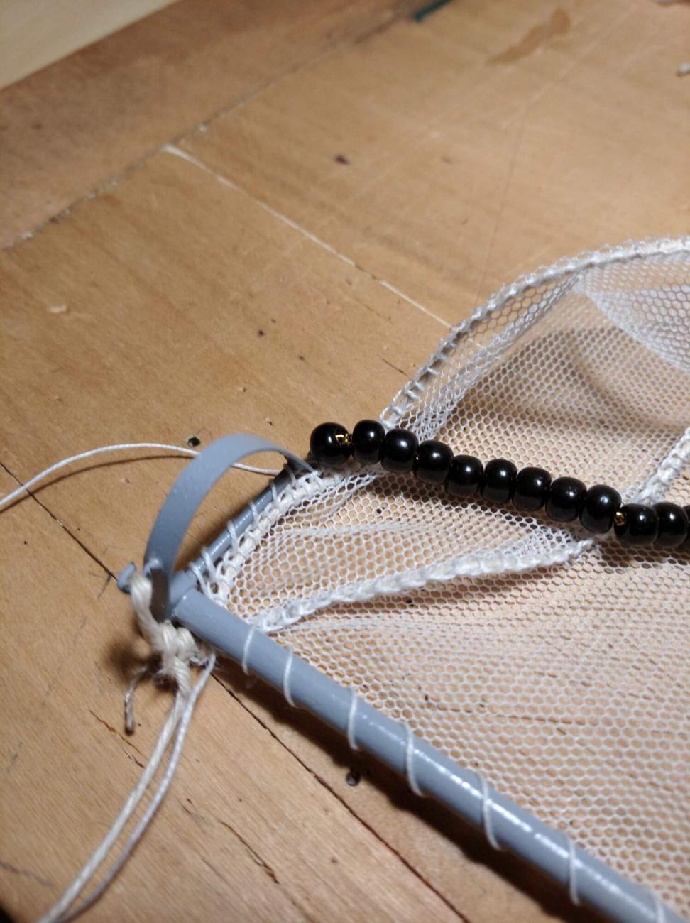 Z plánu jsem si zkopíroval šablony sítě na silnější karton a podle šablon z tylu vystříhal díly sítí. Na sešití jsem použil po obvodu sítě lněnou niť tloušťky 0,7 mm a vlastní šití je lněnou nití 0,3 mm. U role sítě (část jdoucí po dně moře) jsem nahradil dřevěné válečky ze stavebnice černými korálky z manželčiných zásob. Navlečeny jsou na řetízek ze stavebnice.