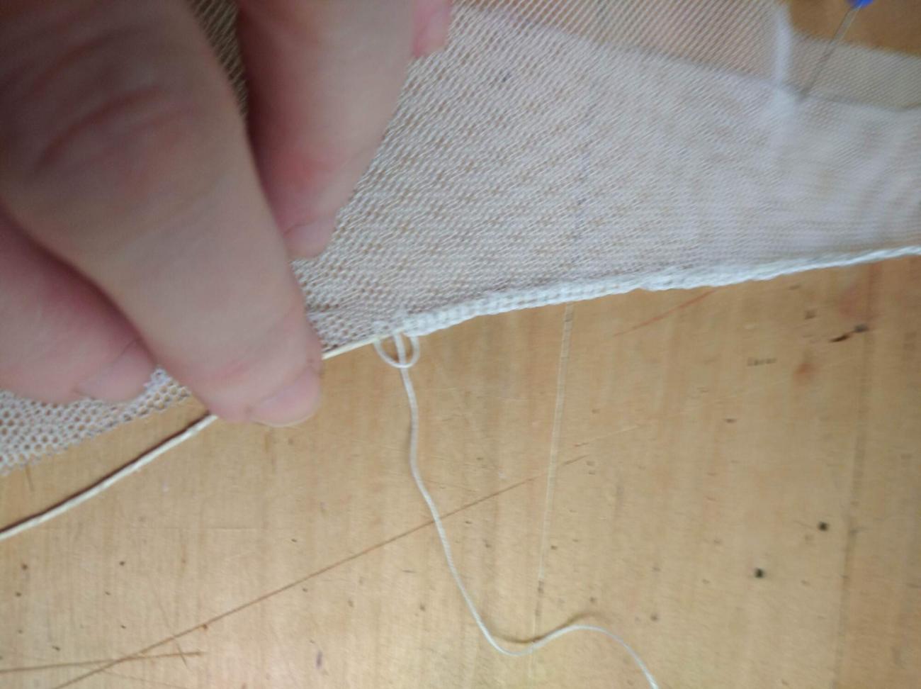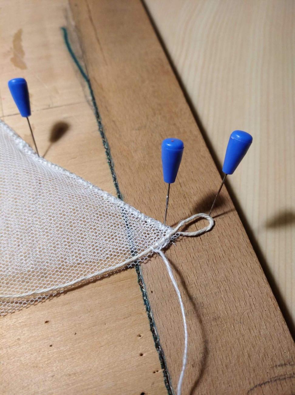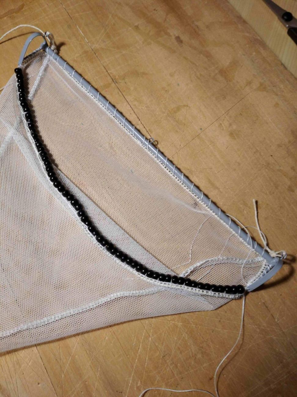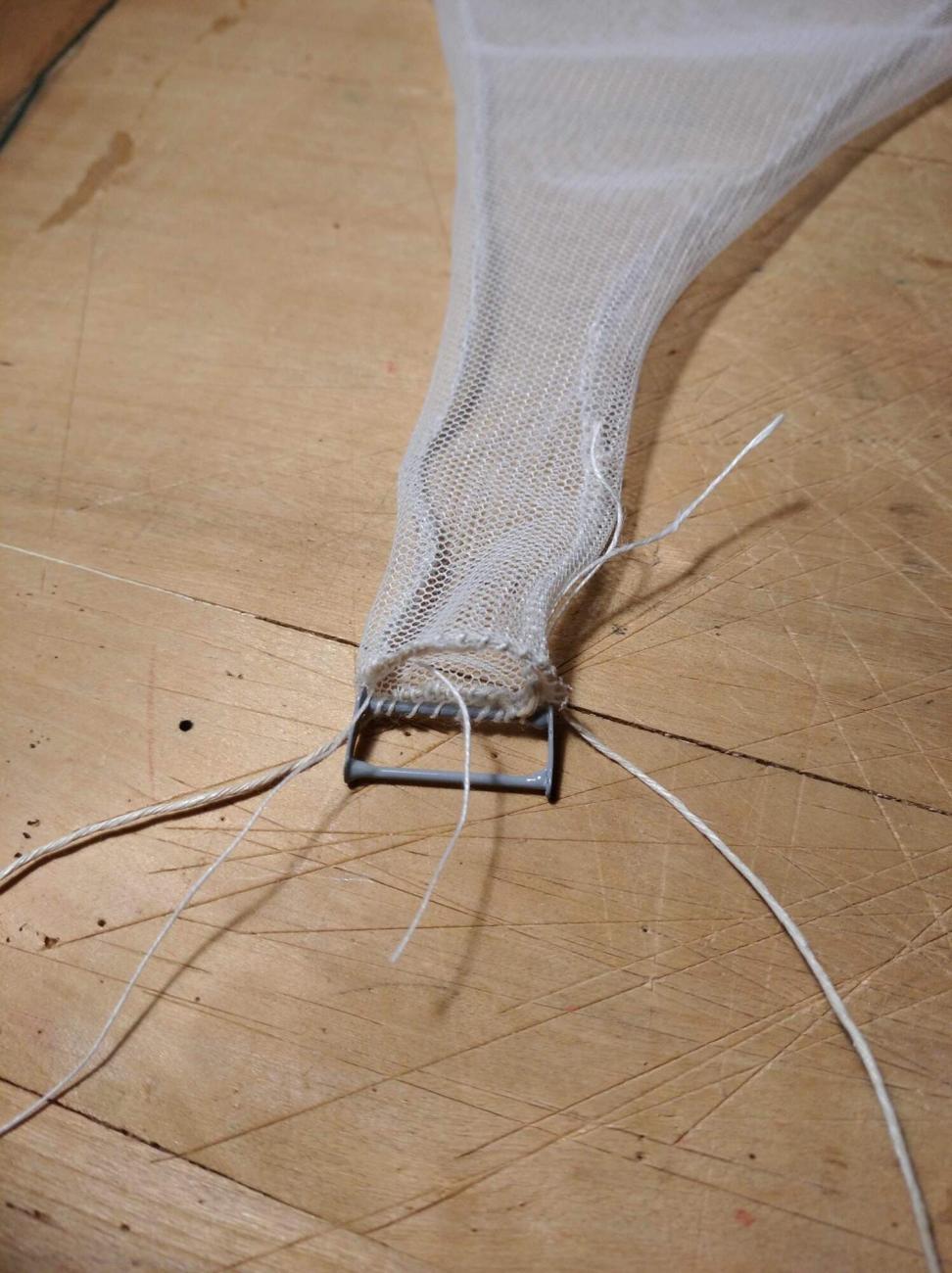A proč jsem vlastně sítě sám nešil, ale ušila je moje manželka? První síť jsem sice ušil kompletní, ale bohužel jsem zvolil špatný postup. Lano po obvodu jsem totiž u lovícího otvoru sítě (u obručí ráhna nesoucí sítě) přišil k spodnímu dílu sítě, u druhé obruče se vrátil zpět a sešil zase oba díly sítě k sobě. Bohužel to byla slepá cesta, celá síť se mi kroutila. Nelíbilo se mi to a tak jsem svoje šití celé vypáral. Po poradě s manželkou jsme přišli, jak to asi má být správně – lemovací lano 0,7 mm musí jít jen po obvodu horní straně sítě. U lovného otvoru bude druhé lano jen kolem obručí a na lemu spodního dílu sítě. Manželka se šití nakonec ujala sama a za 3 večery byly obě sítě hotovy a přišity k obručím ráhen (omlouvám se, ale nenašel jsem přesné české názvosloví pro tato ráhna a obruče těchto sítí).