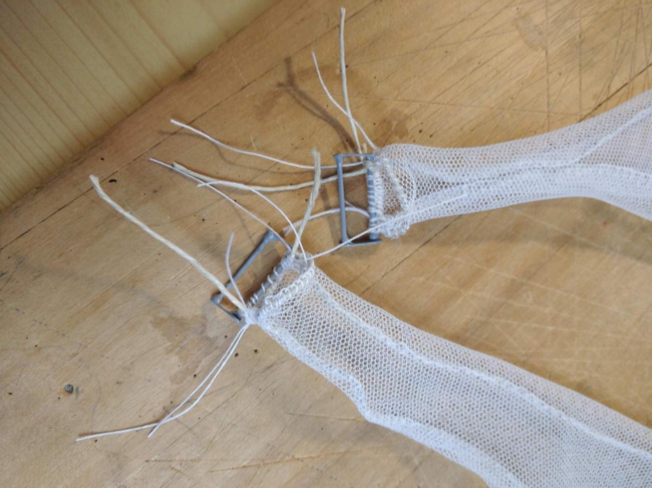 Po dokončení uvazování sítě k ramenům a nosné konstrukce u výsypného otvoru sítě jsem uzlíky zakapal vteřinovým lepidlem a teprve pak nitě zastřihl.