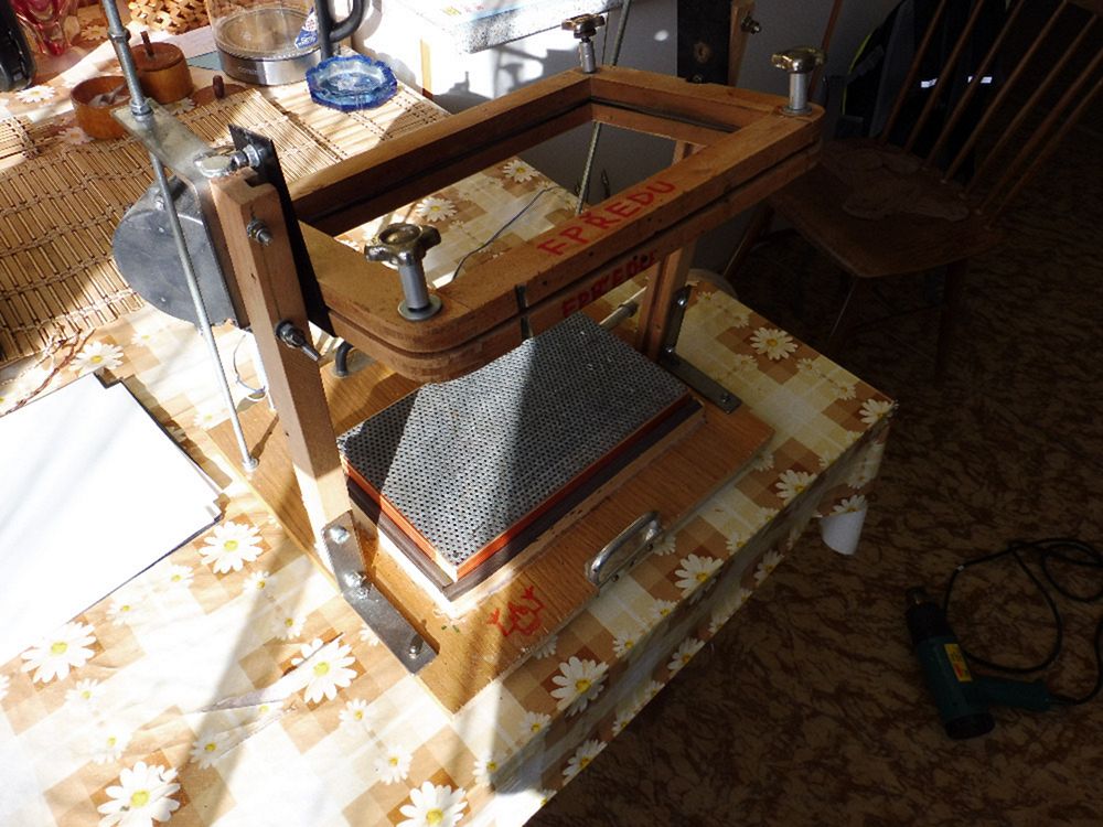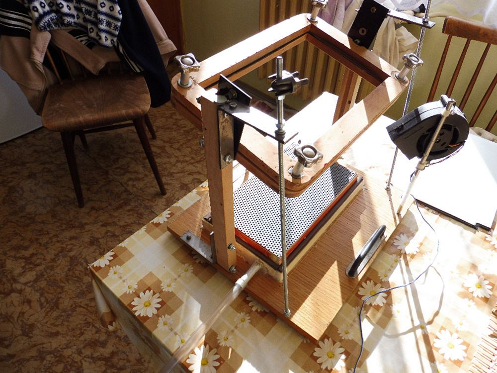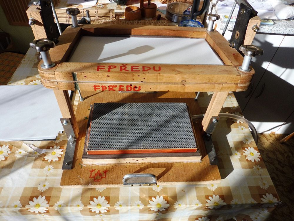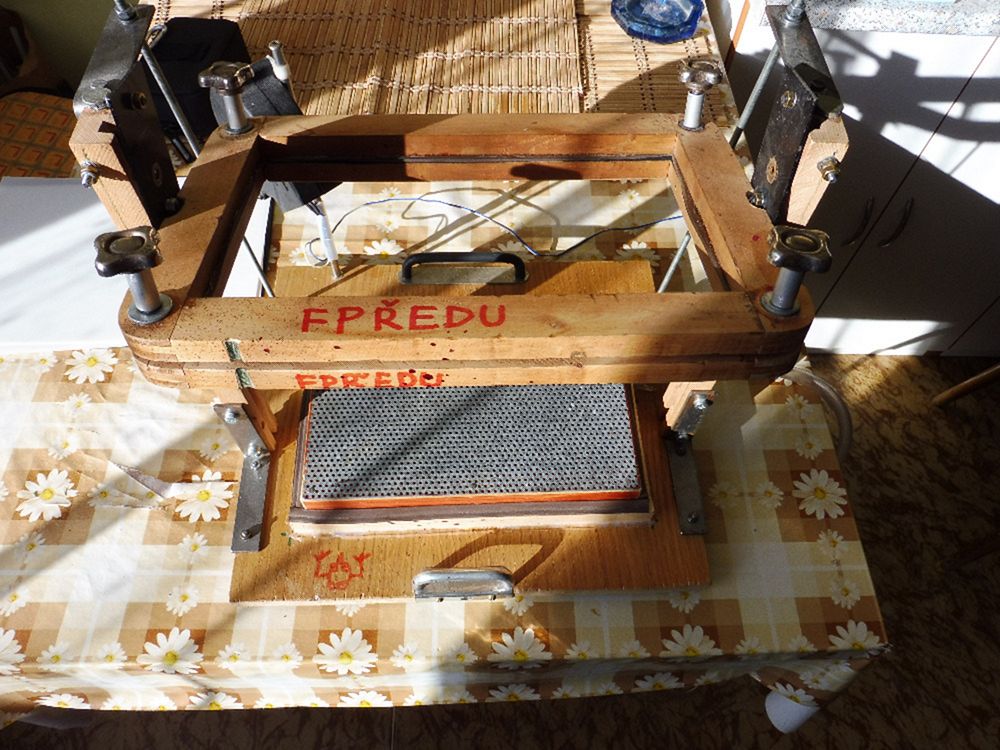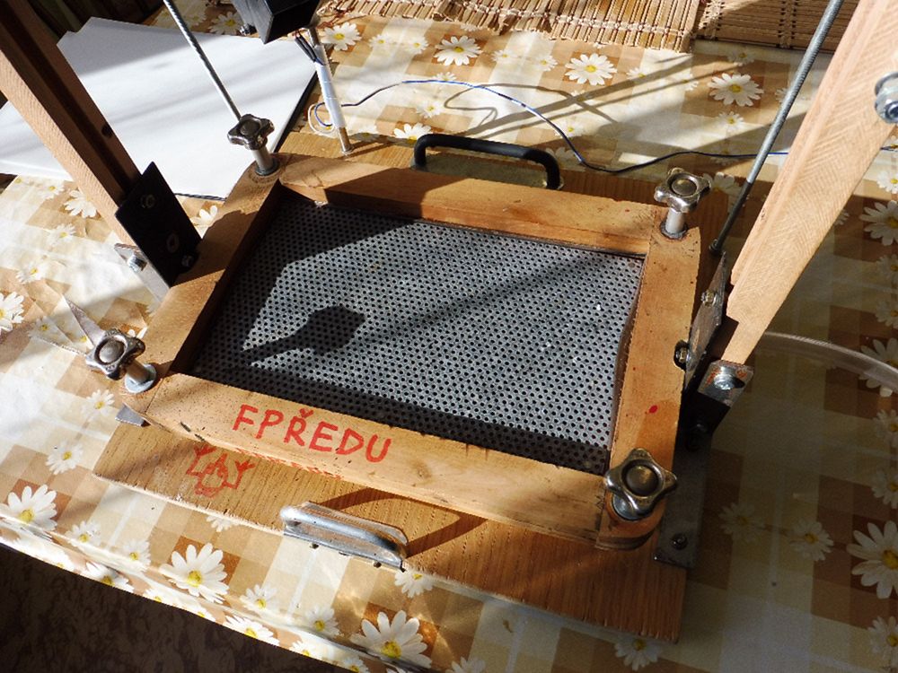 Základ tvoří deska z dvířek s povrchem lamino, držáky pro přenášení a vodicí lišty jsou ze starého kancelářského stolu. Rámeček z bukového dřeva pro upevnění plastové desky pochází z historické tenisové rakety po dědečkovi, která tragicky zahynula při mých tenisových pokusech. Důležité je jednoznačně označit polohu, pokud se zjistí, že je obráceně až když nejde domáčknout na spodní rám, ohřátá deska je v podstatě ztracena a můžeme ji použít leda na lepidlo.