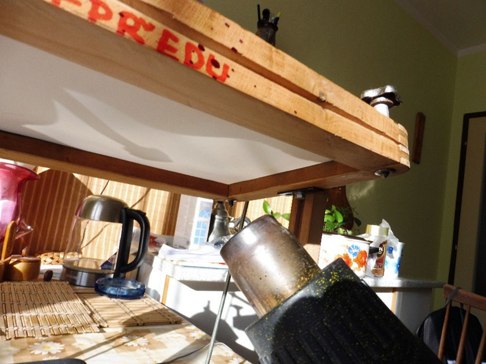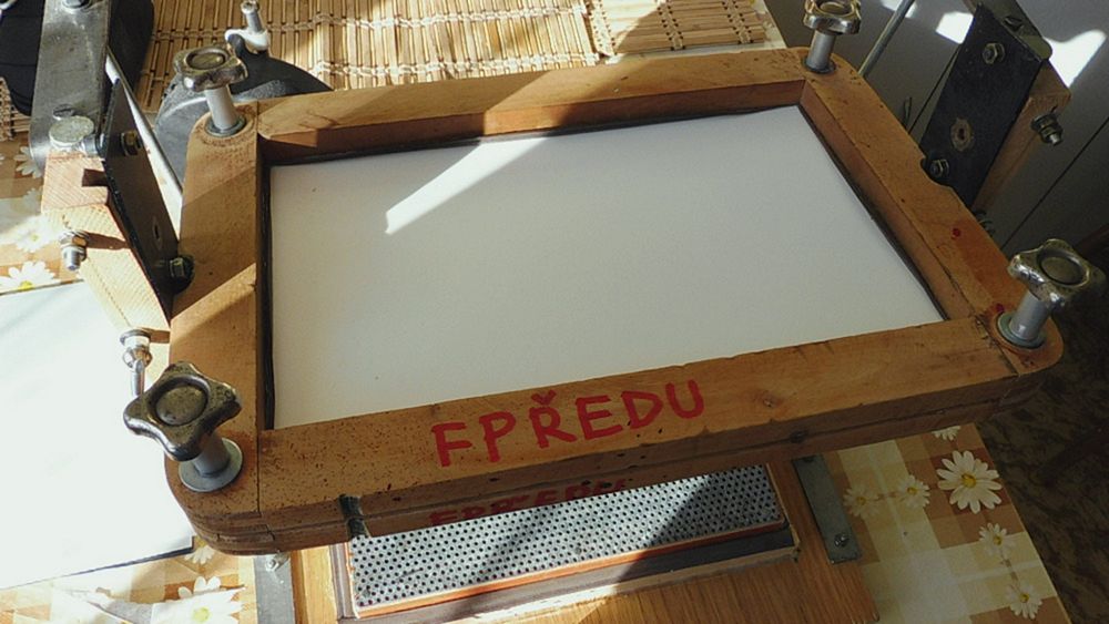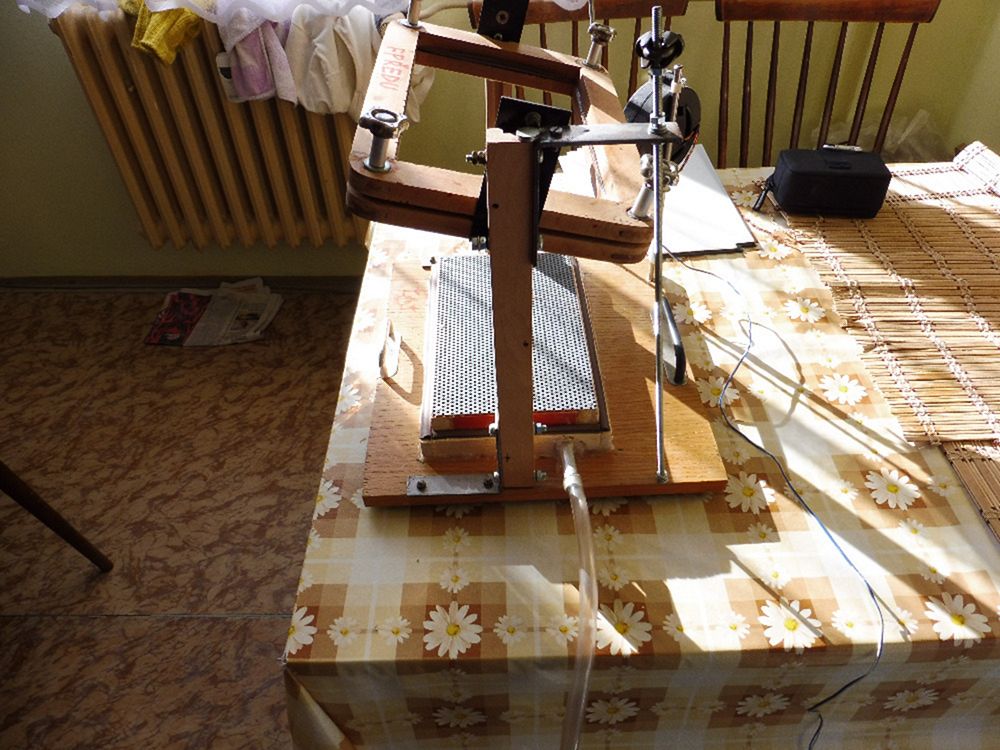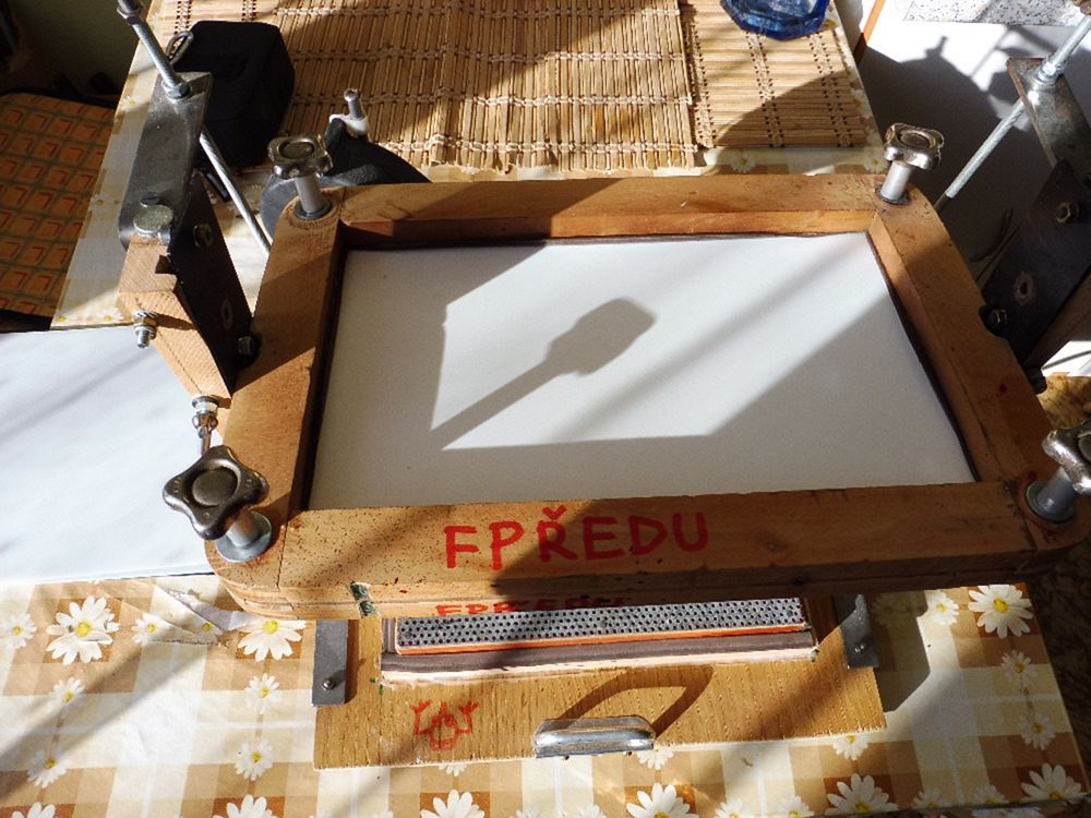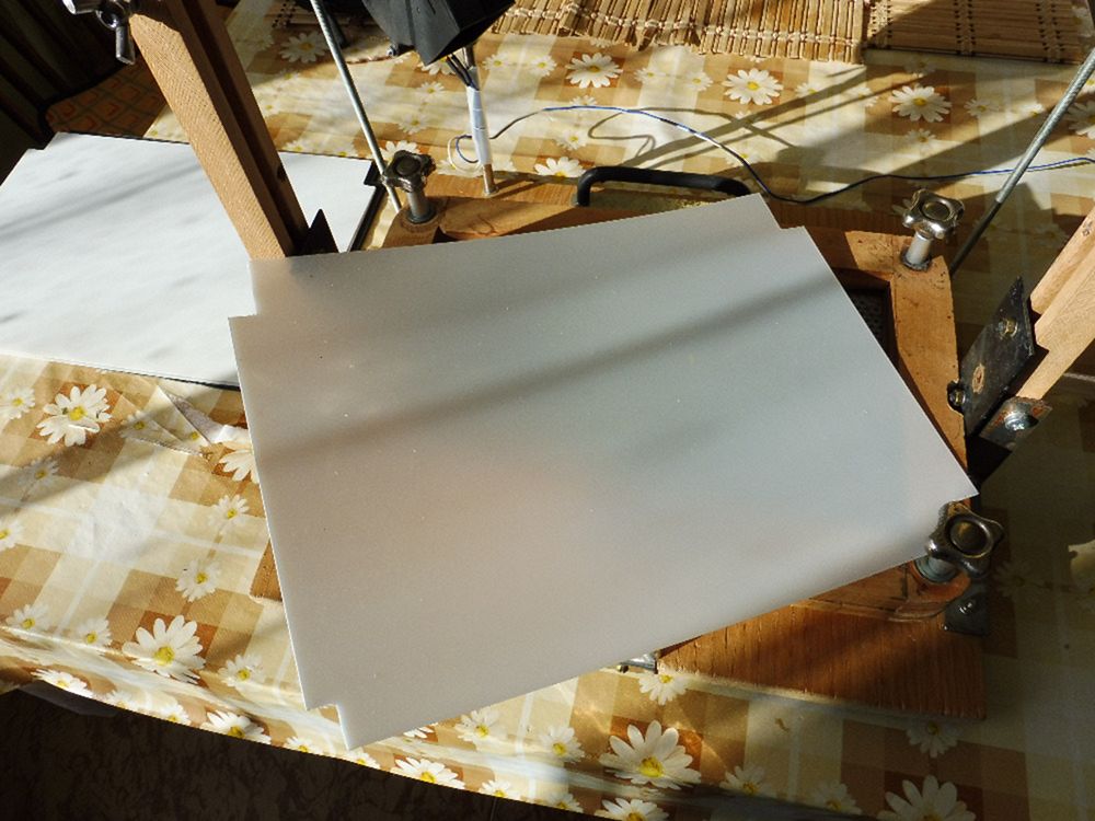 Základ tvoří deska z dvířek s povrchem lamino, držáky pro přenášení a vodicí lišty jsou ze starého kancelářského stolu. Rámeček z bukového dřeva pro upevnění plastové desky pochází z historické tenisové rakety po dědečkovi, která tragicky zahynula při mých tenisových pokusech. Důležité je jednoznačně označit polohu, pokud se zjistí, že je obráceně až když nejde domáčknout na spodní rám, ohřátá deska je v podstatě ztracena a můžeme ji použít leda na lepidlo.
