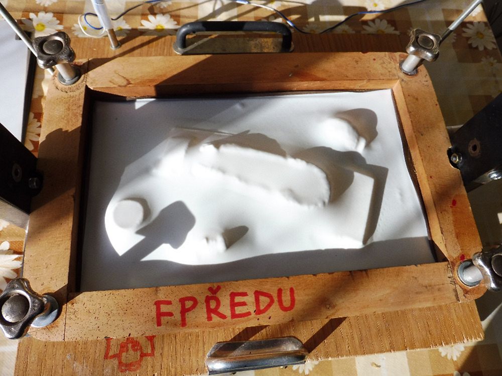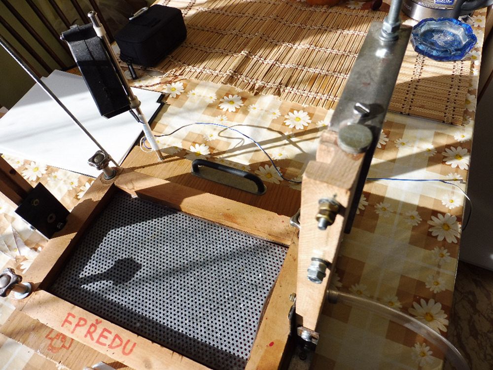 Deska na základnu by měla přesahovat o několik centimetrů rámeček z vnější strany. Z lišt o stejném průřezu, jako lišty rámečku, bude vytvořen vnitřní rám, který cca s milimetrovou vůlí zapadne do vnitřní části spodního rámečku. Vnitřní rám bude připevněn několika vruty k základové desce s nanesenou vrstvou lepidla Chemoprén nebo silikonem apod. Po obvodu na základové desce pod plochou lišty spodního rámečku bude dokola rovněž pás samolepicí pěnové pásky. Na povrch vnitřního rámu bude připevněna několika vruty deska z hustě děrovaného plechu s otvory max. 1,5 mm. Vyhoví i hliníková z dílů klimatizace - železná má ale výhodu, protože můžeme do forem vlepit magnety a fixovat tak jejich polohu podle potřeby. V ploše bude podepřena v pravidelných rozestupech cca 5cm špalíky ze zbytků lišt rámečku, přilepenými např. vteřinovým lepidlem. V některém rohu bude vlepen kousek trubky pro připojení zdroje podtlaku - postačí průměr cca 12 mm, tak, aby při práci nepřekážela, spíše tedy k zadní hraně rámečku.