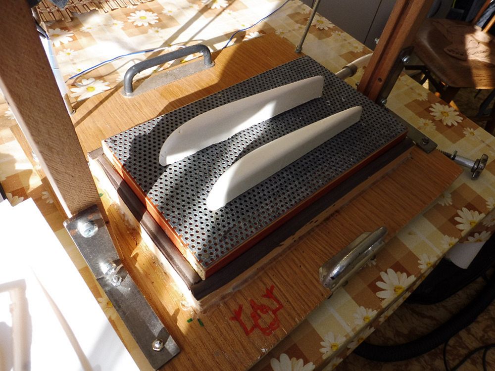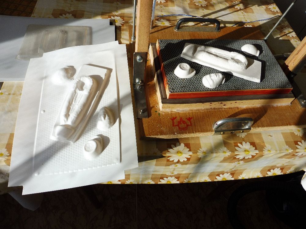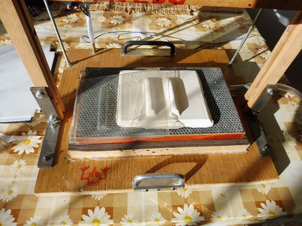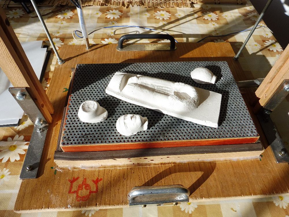 Následuje odsátí a vytažení výlisku. Spustíme větrák a vysavač přestavíme na asi polovinu výkonu. Po asi půlminutě vysavač vypneme a výlisek dochladíme, rámeček nadzvedneme asi o 1 cm a na výlisek v nejvyšším místě mírně zatlačíme shora nebo v místě, kde forma svírá ostřejší úhel se základnou rukou, až se uvolní z formy.