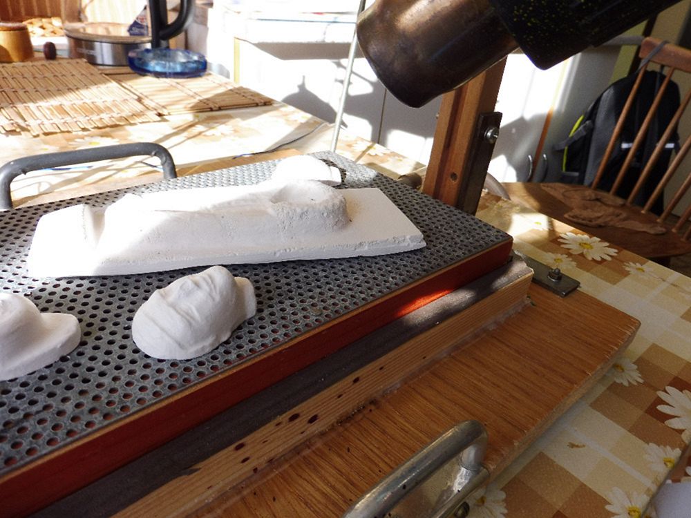 Před vlastním ohřevem na základnu z děrovaného plechu rozmístíme formy. Pokud možno rovnoměrně, tak, aby nejvyšší části byly nejvíce ve středu základny a od okraje vnitřní části rámu vzdáleny alespoň na výšku formy. Formy mírně ohřejeme pistolí na cca 40 °C (vlažné).