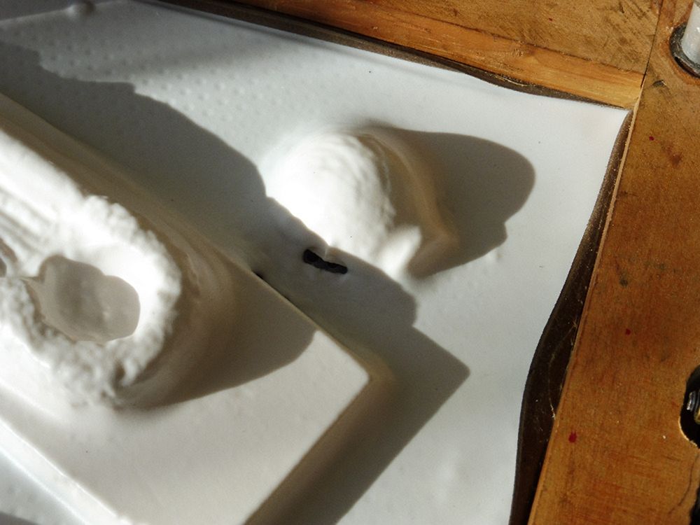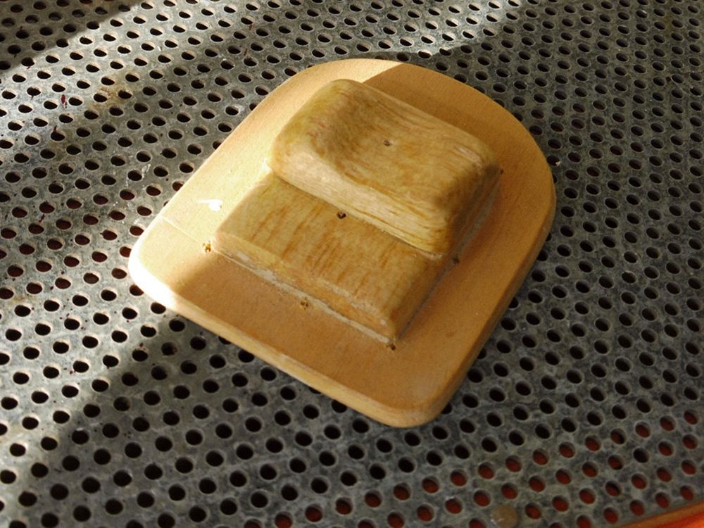 Po vytvrzení formy v konkávních profilech (podmodelovaných) je nutné vyvrtat cca 1mm otvory pro odsátí vzduchu - folie během tažení místa uzavře a výsledek by byl nedotažený výlisek. Viz originální forma zádové opěrky pilota modelu Rarach, překližka a balsa napuštěná polyesterovou pryskyřicí, stáří 25 let.