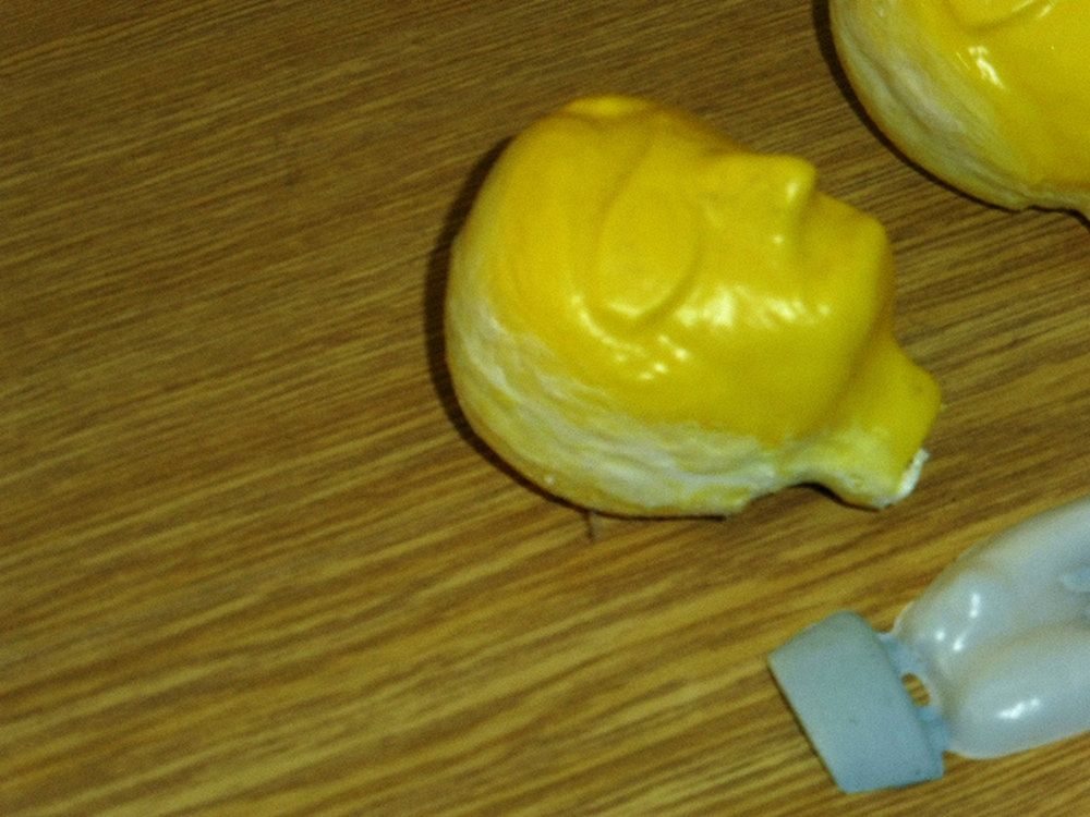 … a nebo přehřátím po pokusu o záchranu místním neopatrným ohřevem pistolí (černá díra temene hlavy vpravo nahoře).