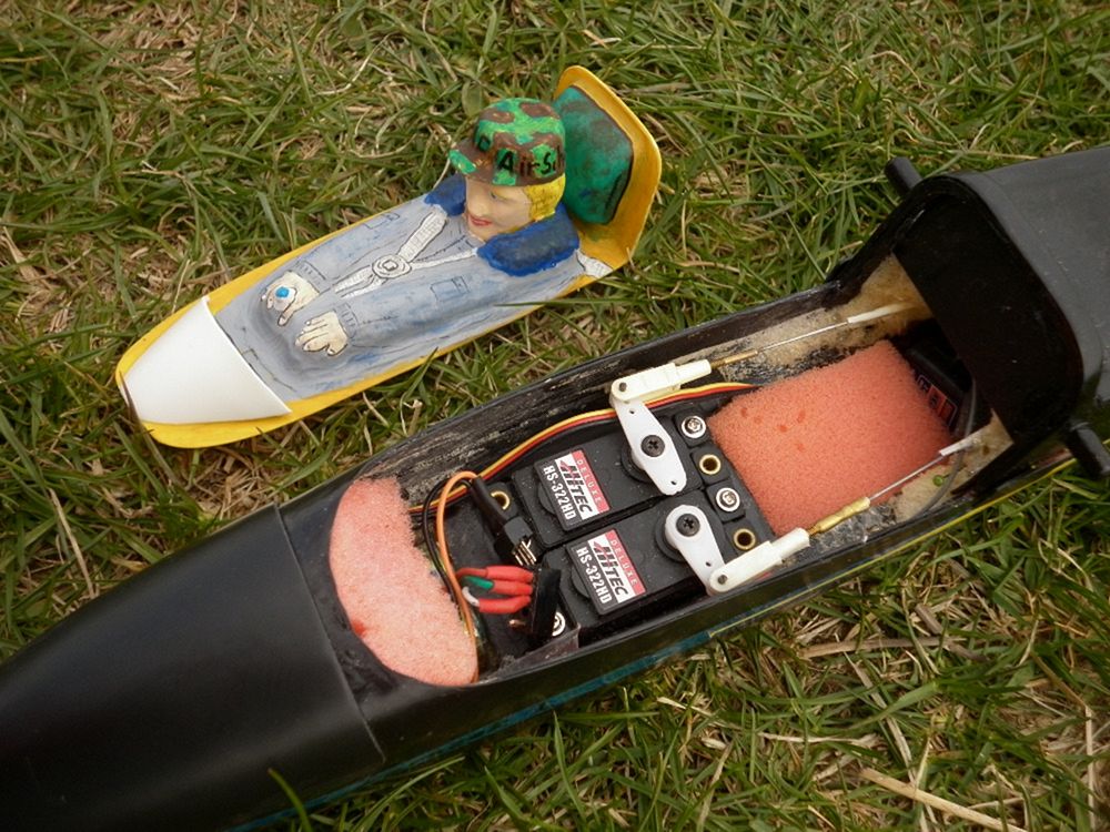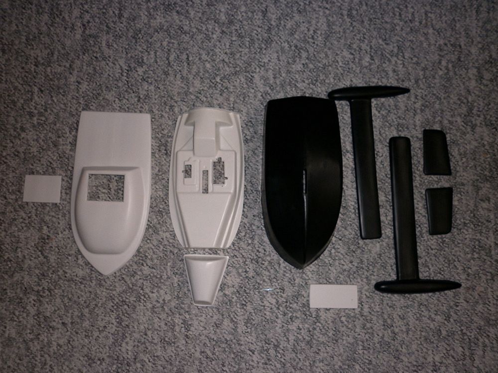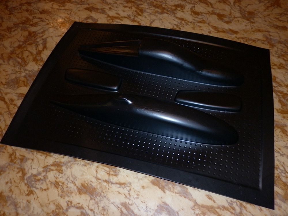 Zatímco folie Durofol se nesmršťuje (a lze ji tedy použít jako ochranný obal na formy), a jde „dolu” z forem snadno, PSH polystyren se smrští cca o 2 - 4 mm na metr délky a je potřeba mu s citem „pomoct”. Pro příklad dvojice krytek serv do křídla. Průhlednou krytku lze dobře použít i při kontrole montáže, případně ji pak z vnitřní strany nastříkat barvou.