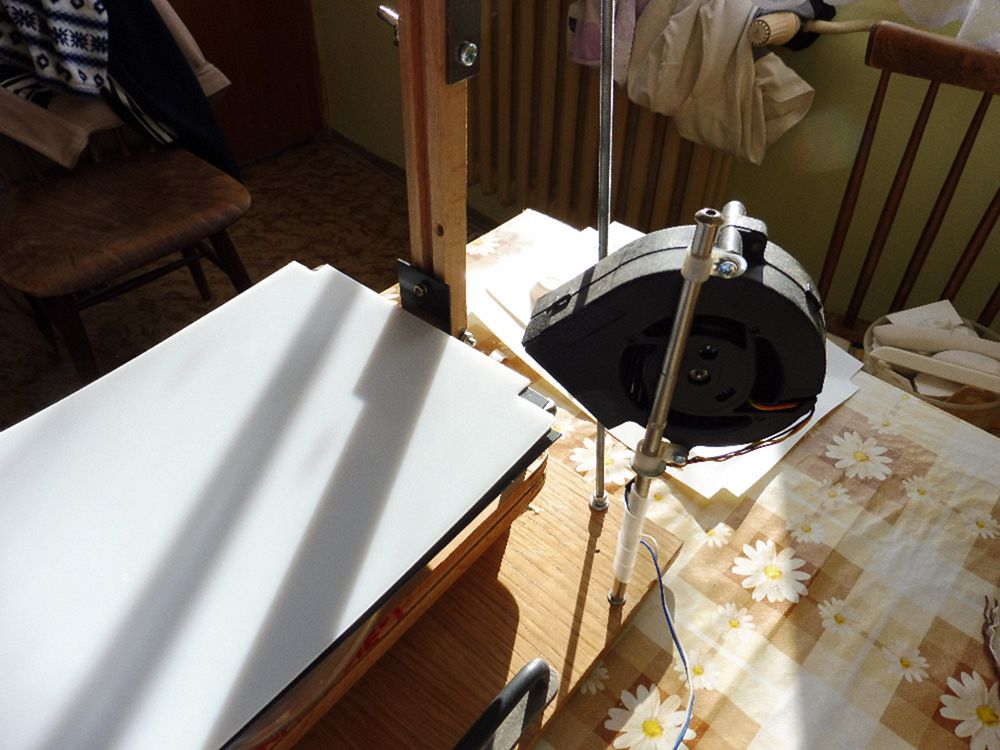 Na horním konci vodících lišt jsou přilepeny dva silné magnety ze zahynulých sluchátek. Suplují třetí ruku - rámeček je veden v lištách hlavami šroubů, které se pro ohřev desky „přilepí” k magnetům a drží rámeček v horní poloze šikmo, aby bylo možné kontrolovat pohledem prověšení desky.