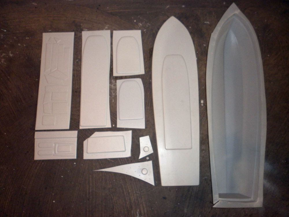 Pro větší modely vyhoví i skelný laminát v tlusté vrstvě vyztužený žebry a vyplněný sádrou. Například u trupu plachetnice Jane, délka cca 750 mm, šířka a hloubka dna asi 150 mm, byla forma laminována do dělené negativní formy (sejmuté z prototypu) v tlouštce cca 5 mm z ChS 104 a asi deset výztužných žeber a sokl z překližky 10mm.