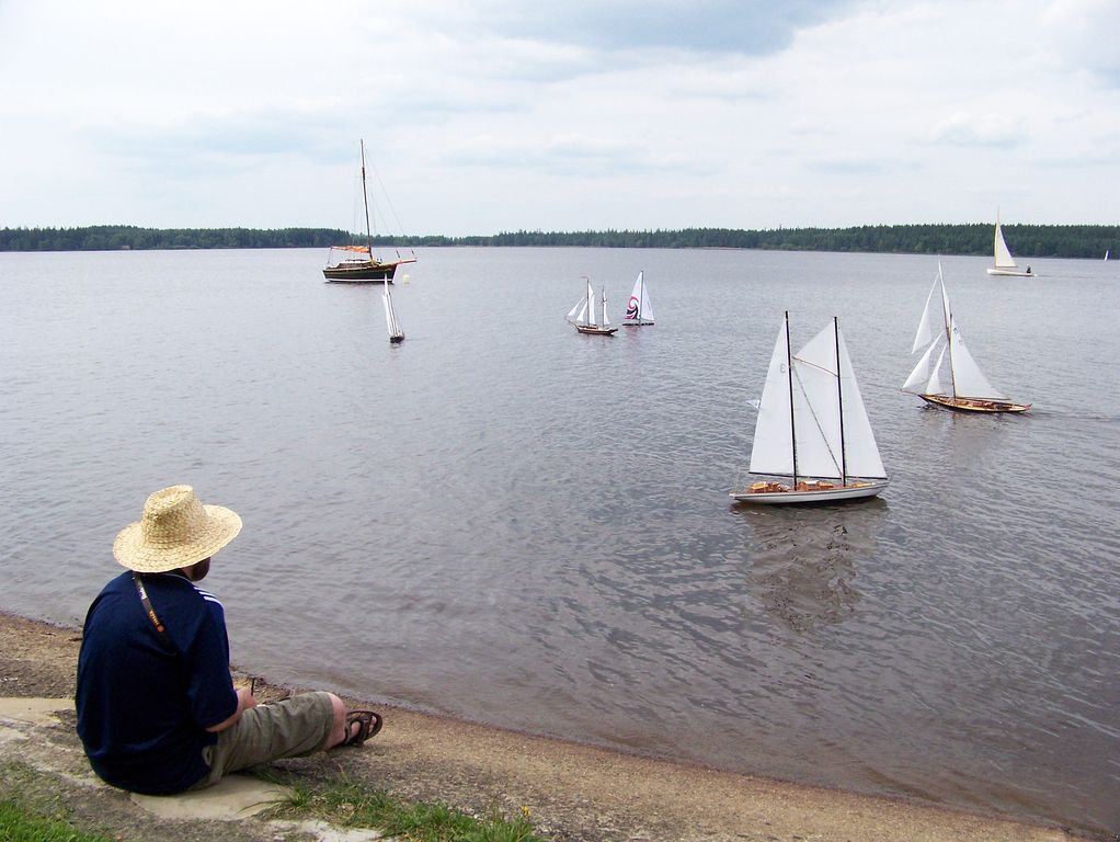 V mezičase, kdy ostatní seděli u sklenky něčeho dobrého, jsem stále vyléval vodu z KuM. Chvilku před druhou odpolední jízdou mezi nás zavítal neznámý modelář, aby se zeptal na námi používané kanály, jestli si může o kousek vedle pouštět plachetnici. Nekompromisně byl nahnán na hromadný start všech plachetnic, ač se mu příliš nechtělo.