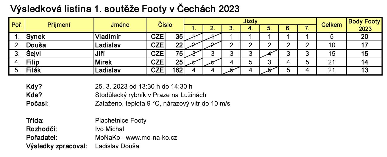 Letošní novinkou obnoveného seriálu soutěží plachetnic Footy v Čechách 2023 je podmínka, aby se každé započítávané soutěže zúčastnilo alespoň 5 modelů. To se povedlo jen těsně, když šestý přihlášený Kamil Musiejkiewicz z Polska nakonec nedorazil a Dadu Footyna natolik neposlouchala, že na účast v soutěži nemohl vůbec pomýšlet.