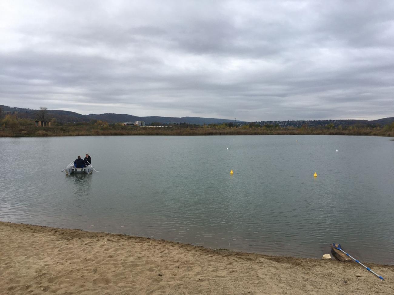 Přestože je vodní plocha asi tři metry pod okolním terénem, v době mé návštěvy krásně foukalo i u vodní hladiny. Přičítám to tomu, že mezi Berounkou a jezerem nejsou žádné stavby a ani z druhé strany jich díky golfovému hřišti není mnoho.