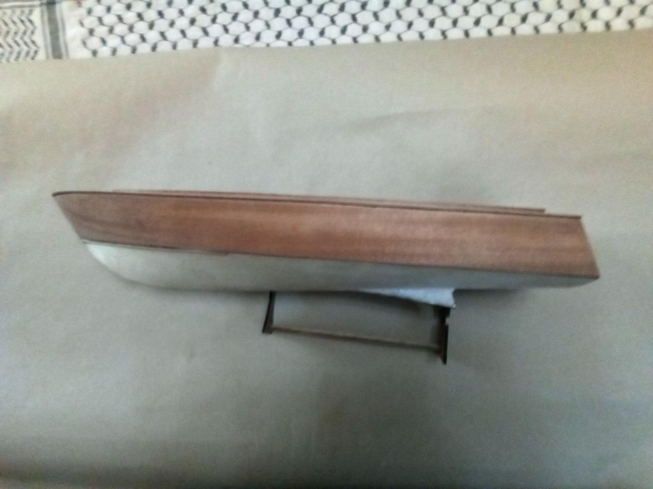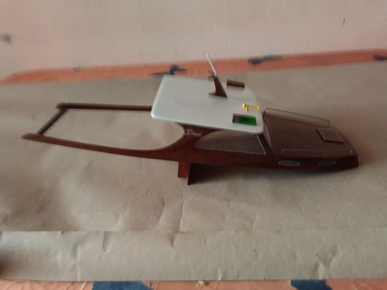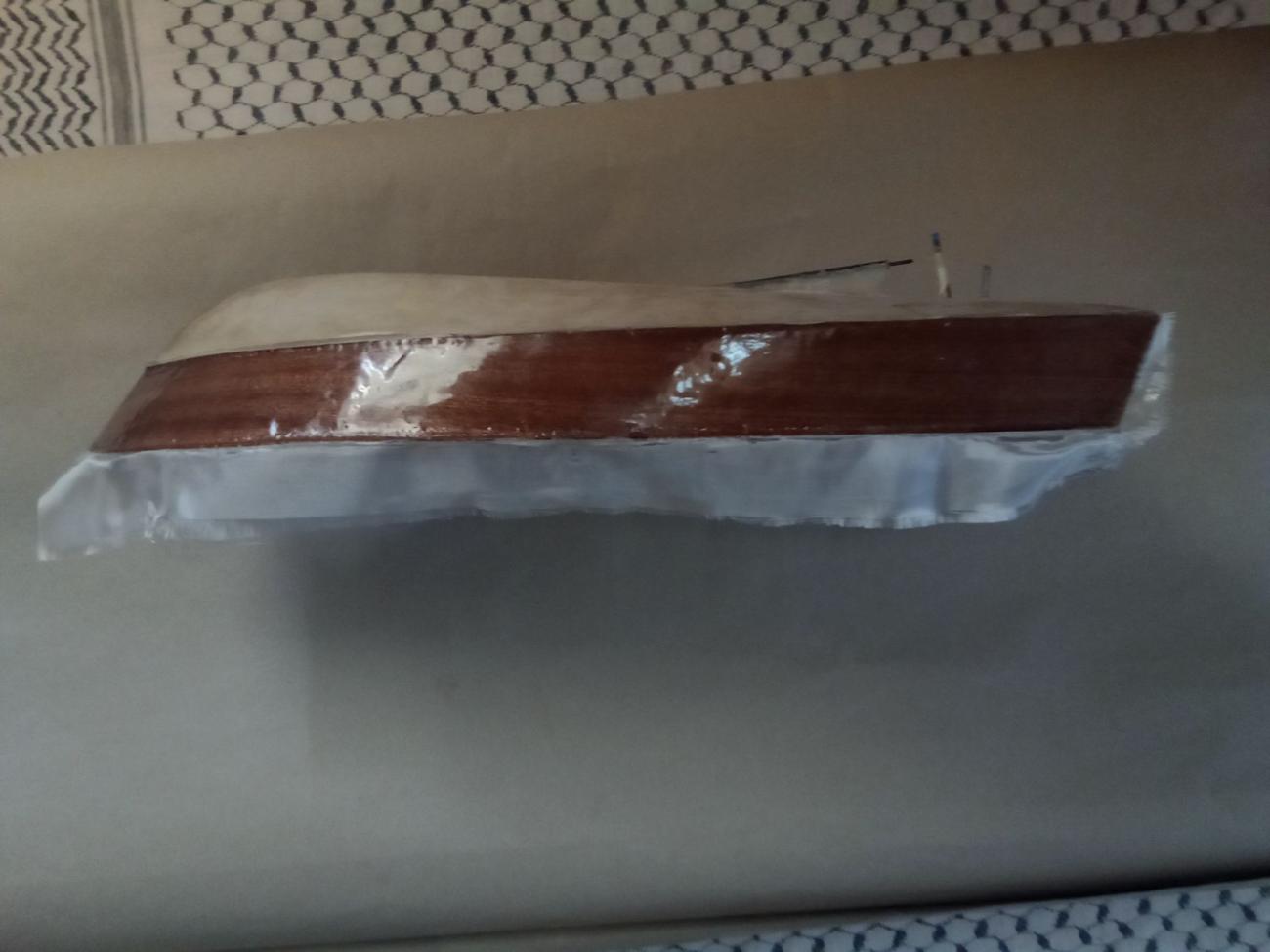 Motor stejnosměrný MIG 480 Li s chladící spirálou, regulátor stejnosměrný oboustranný New Rain 60 A, kormidelní digitální microservo Corona DS 939 MG (2,5 kg tah, kovové převody)a lodní šroub Graupner 3-list průměru 26 mm. Po rychlé hrubé stavbě následovala pro mě nejhorší etapa – laminování s tkaninou, vytření překližkového vnitřku trupu i kabiny epoxidem. A pak pořád dokola – trocha tmelení, moře broušení, barvení, lakování… Nakonec uplynul téměř celý rok, než jsem dílo dokončil. Skoro jako pověstné – do roka a do dne, hyn sa hukáže…![]()