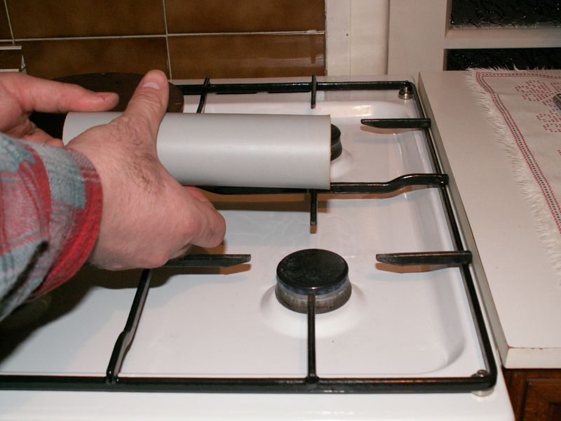1. Nad horákom plynového kuchynského šporáku som pozvolne nahrieval koniec novodurovej trubky a po jeho zmäknutí som ho postupne navliekal a tvaroval na decový pohár. Postupoval som až do tej miery, pokiaľ som dokázal pohár udržať v ruke. Vzhľadom ku skutočnosti, že trubka sa pri vychladaní nepatrne stiahne, je dobré, aby jej vychladanie postupovalo mierne. Počas postupného vychadania trubky je dobré pohárom v nej neutále pootáčať. Pri prudkom schladení trubky napríklad pod tečúcou vodou dôjde k rýchlemu čiastočnému zmršteniu materiálu a pohár sa nedá pohodlne vytiahnuť von.