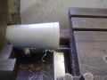 2. Prvý vytvorený a vychladnutý kónus som premeral a jeho čelo som na sústruhu upichol v mieste, kde sa jeho vnútorný priemer rovnal priemeru lodnej skrutky plus 5mm, aby pri zložení celého kompletu vznikla medzi telom dýzy a listom lodnej skrutky dilatácia 2,5 mm. Nakoľko nie som odborník, hĺbku tela dýzy som zvolil iba od oka a telo som upichol s dĺžkou 45 mm.