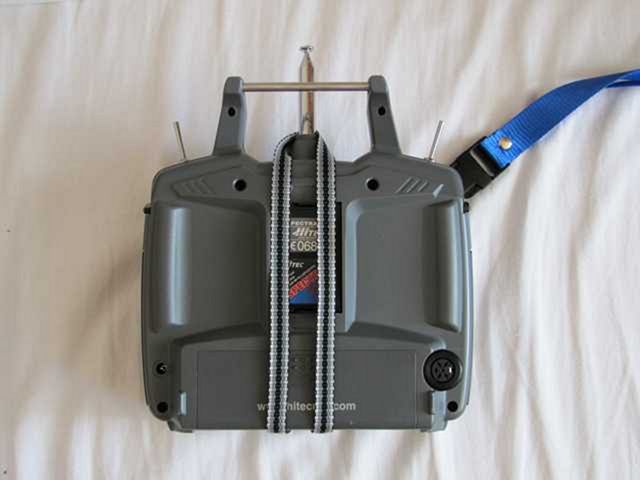Ještě je možno nasadit pásek na držadlo, místo na anténu. Pak je možno přizvednutím vysílače a shozením pásku z držadla kšandy zcela uvolnit a vysílač jen visí za původní oko. Tuto variantu aplikuji nyní po upgrade vysílacího modulu na 2,4 GHz.