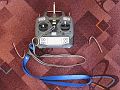 Nebudu zde popisovat konstrukci, ta je myslím z obrázků dostatečně zřejmá a každý bude mít k dispozici jiný materiál. Já jsem nakoupil v galanterii 1 cm široký pásek. Kšandy hlavně zabraňují překlopení vysílače kniply k tělu a tím spuštění motoru. Sklopení anténou dolů je bráněno polohou těžiště. Kšandy jsou hlavně určeny k prvotní částečné fixaci vysílače před vypuštěním modelu.