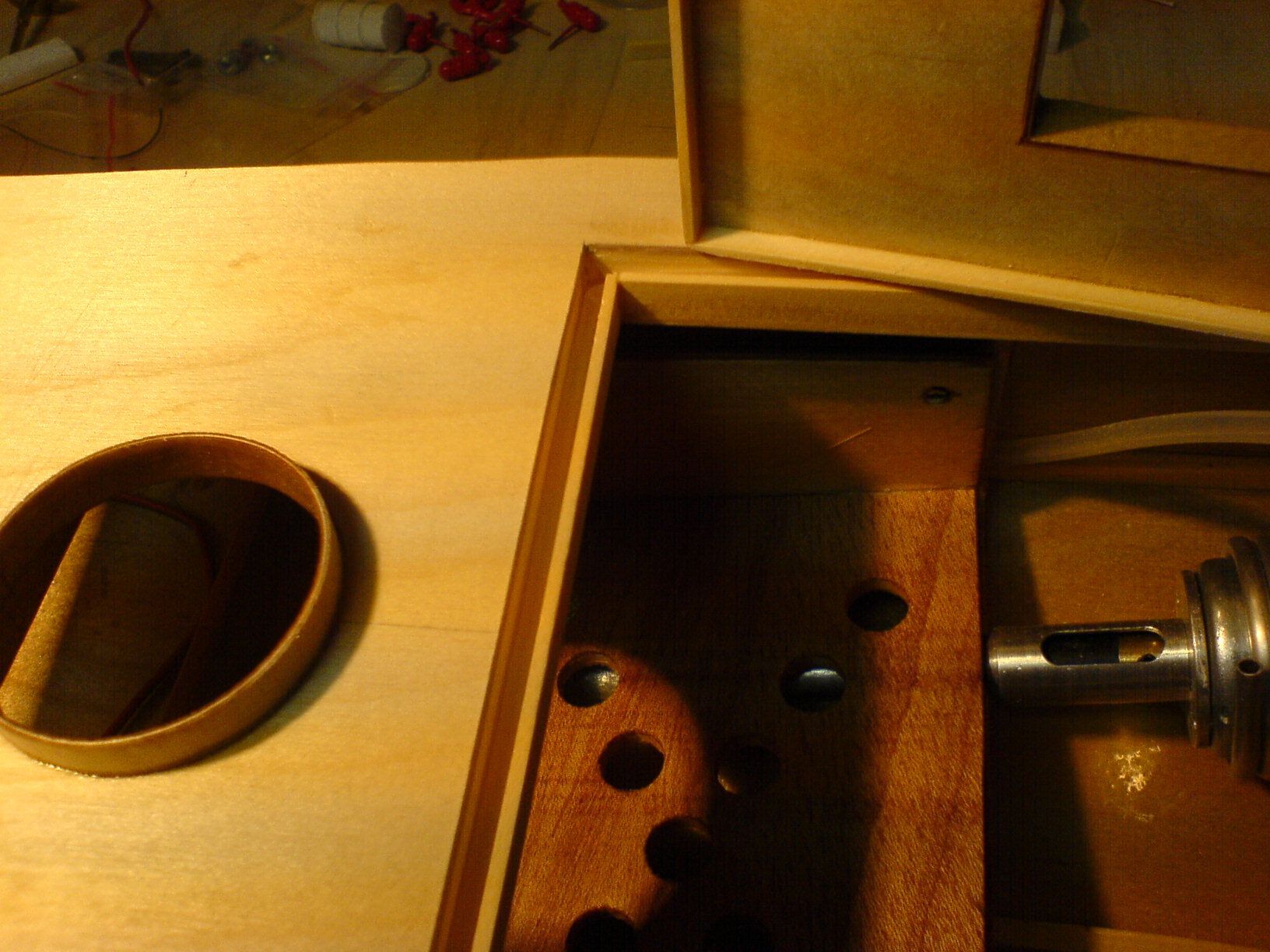 Vodní chlazení je samozřejmé, vytékající voda je efektní. Uvnitř trupu je uděláno místo pro Pb aku na dvou místech. Mám rád dlouhou jízdu bez nabíjení. V návodu jsou dvě možnosti provedení paluby. Rozhodl jsem se pro kompromis. Udělal jsem výřez větší než nástavba a osazení drážkou ze silikonové hadičky.(foto 7) Trup je laminován dvakrát stodvacítkou tkaninou. Nasávání jsem udělal tak, aby navazovala na kormidla.(foto8) Konečně nastal ten okamžik a po základovce se začalo uvažovat o povrchové úpravě. Jednobarevná úprava byla zavrhnuta. Hodně barev! Takto to začalo, čmáráním airbraschovou pistolkou!(foto9) Barvy jsou použity dvousložkové odstíny podle RAL. Je to moje první použití této technologie. Komresor Calex lednička. No a toto je výsledek.(foto11) Tak a nyní udělat pár detailů. Začal jsem člunem a výfuky. Člun je vybroušen z balzy, dno překližka. Rohož je udělána z lišt 2x5mm. Výfuky musí být samozřejmě dva. Mosaz a měď, celé pájeno.(foto13) V návodu není žádné zábradlí ale, když už jsem v tom pájení…. Materiál Cu 1,5mm a 2.5mm.(foto14)