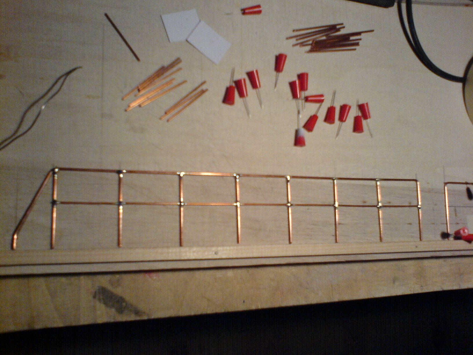 Rozhodl jsem se pro klasiku, jak je popsána v návodu. Žebra okopírována na papír a nalepena na překližku 4mm.(foto 1). Stavba provedena na desce dnem vzhůru. Lišty použity 5x5mm. Potah udělán z voduvzdorné překližky 1mm(foto3). Příď po druhé žebro je uděláno vodotěsné a „vycpáno pěnou“ snad to pomůže, pokud se snad……… No a nyní nastalo dilema, jak na palubu dvě dělové věže? Nebo kaťuše? Samozřejmě po poradě se synkem je jasno! Rakety! (ještě že je na koho to svést) Tak je rozhodnuto, to jsem ještě netušil, co mě čeká. Paluba z překližky 1,5mm vyvrtána, vyřezána a olemována. (foto 4)Pohon byl po probrání na chatu MoNaKa jasný 2x 600.(foto5)