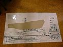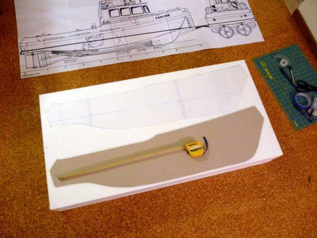 Podľa plánu som vyrobil z transparentnej fólie ešte šablónu pôdorysu lode ( polovicu trupu) . Na fóliu som si nakreslil priebeh všetkých dôležitých línii trupu ( najväčšia šírka, línie bortov, línie dna). Podľa šablóny som na polystyrénový blok nakreslil pôdorys, nahrubo orezal nožom a obrúsil do pôdorysného tvaru.