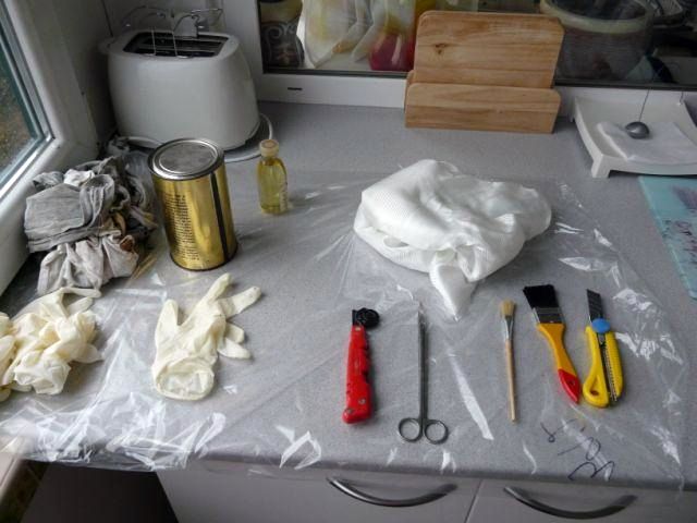 Nachystal som si pomôcky na laminovanie. Ako živicu som použil staré zásoby epoxidovej CHS1500, čo je laminovacia živica. Epoxid 1200 je veľmi hustý a predovšetkým to je lepidlo a nie je určený na laminovanie a preto ho vrelo neodporúčam. V súčasnosti sú dostupné moderné laminovacie živice napr. Letoxit a podobne, ktoré sú ešte podstatne lepšie, ako CHS 1500, najmä preto že sú ešte redšie, čo je výhoda pri spracovaní a výsledný laminát je ešte kvalitnejší a tvrdší. Gumové rukavice tiež odporúčam použiť. Alergická reakcia nie je až taká sranda.
