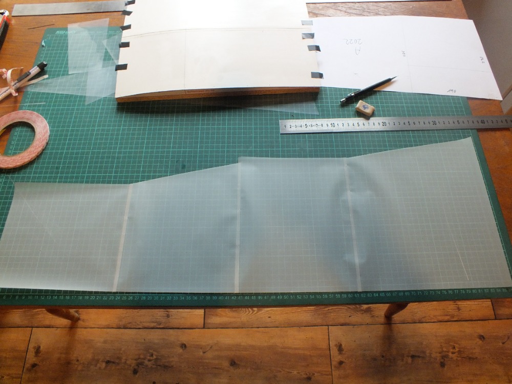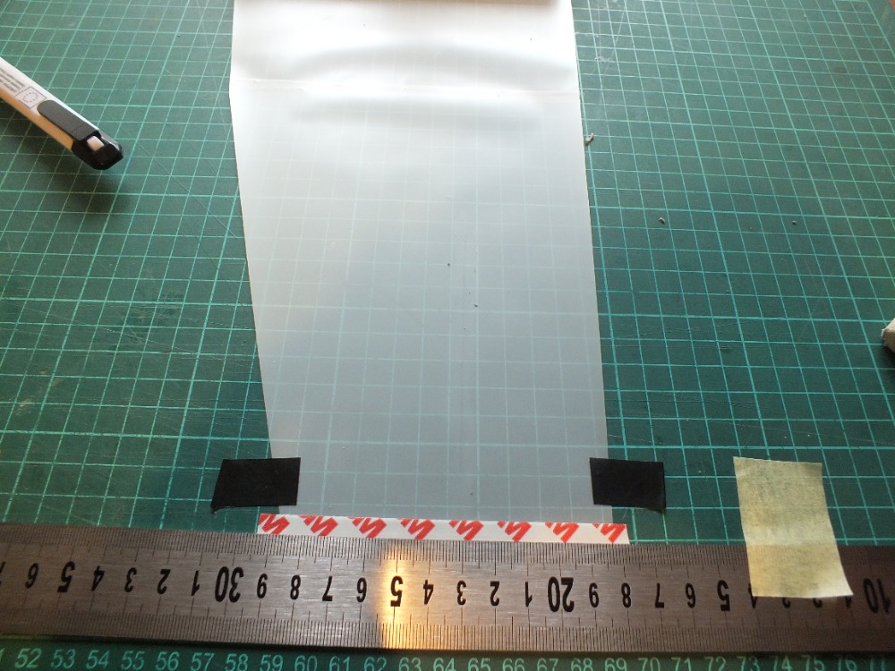 - Nejdřív si nařežu mylar na požadovanou velikost. Na výšku o 6 mm víc (šířka 3M pásky), z boku přidám alespoň centimetr na každou stranu, na spodní díl zespoda taky. Na vrchní díl přidávám 2 cm, bude se tam lepit výztuha (obr. 1 a 2).