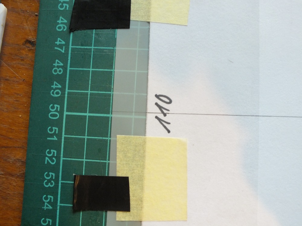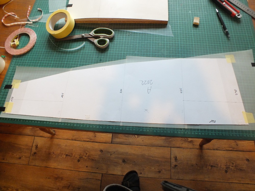 - Tak pokračuji dál. Po slepení všech dílů přiložím šablonu a připasuji ji podle lepených dílů a vrcholů profilu, zafixuji šablonu páskou a oříznu, kromě vrchu (obr. 13 až 17).
