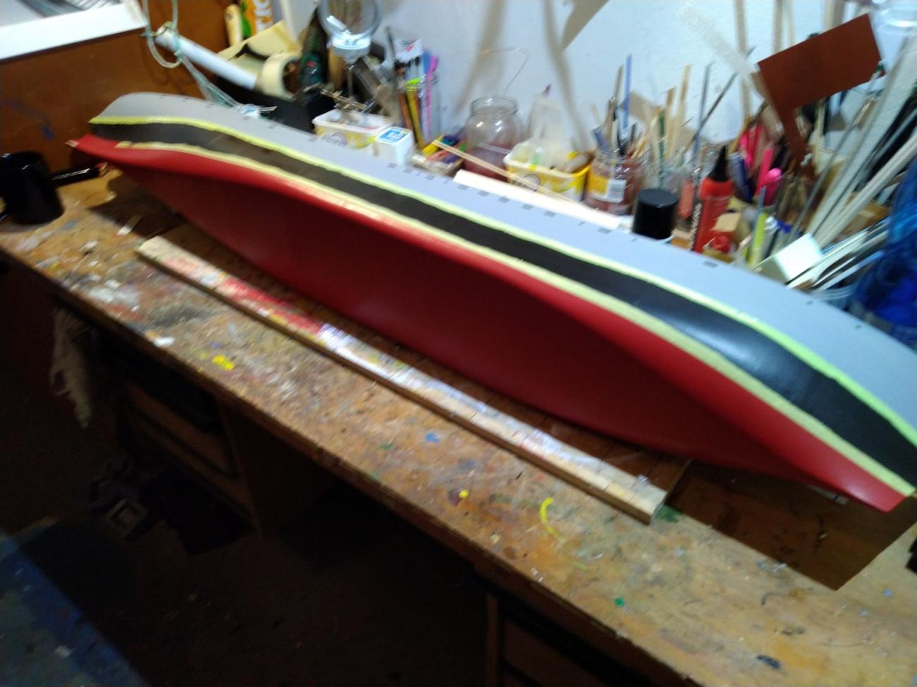 Dalším krokem byla zkouška těsnosti ve vodě. Po položení na hladinu se trup velice kolébal, vzhledem k velikosti je to dost lehké. Začal jsem nakládat. Jako první olověné akumulátory. Mám tři 6 V/5 Ah, což bylo málo. Došlo na olova k potápěčskému opasku, ty byly čtyři. Posouváním zátěží jsem trup vytrimoval. Pěkně se usadil a stabilizoval. V tu chvíli byla na místě obava, zda se mi trup nezlomí, přece jen je to dlouhé a tištěné. Nechal jsem ho plavat asi dvě hodiny, při pěti až deseti minutových vizuálních kontrolách. Po kontrole vnitřku bylo sucho, což je dobré. Po vytažení z vody jsem osušil vnější stranu trupu a čekal, kde se objeví kapky. Přece jen je to tisk po 0,2 mm silných vrstvách. Nenašel jsem žádnou netěsnost, takže došlo na finální nátěry. Boky šedé, rozdíl maximálního a minimálního ponoru černá a spodek červená.