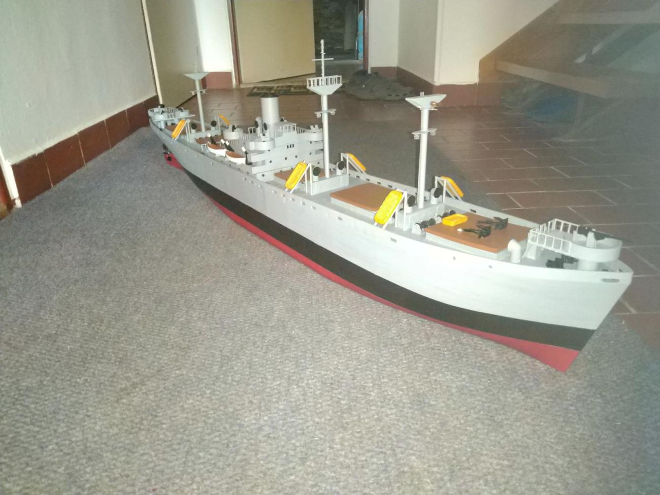 Kryty nákladových prostorů jsou vytisknuté jako každý jednotlivý kus, mají zespodu číslo a šipku po směru plavby, záměna je nemožná. V originále byly kryté plachtou, tak jsem je natřel hnědou barvou. Hlavní paluba je osazena sérií úvazníků na místech, kde by měly být. Z vlastní zkušenosti vím, že stopadesáti metrová nákladní loď se musí být schopná uvázat i k šedesát metrů dlouhému nábřeží. Takže úvazníků jsem osadil dostatek, opět výhoda tisku, jsou všechny stejné. Pod nástavbou příďového kanonu jsou osazeny kotevní navijáky a imitace bubnů s uvazovacími lany. Jak jsem již uvedl, Liberty měly dostatek záchranných prostředků pro kompletní posádku: námořnickou obsluhu a vojenskou obsluhu kanonů a protileteckých kulometů. Na palubu po stranách palubních domků, jsem z kuchyňských špejlí vytvořil konstrukce skluzů a na ně nalepil záchranné vory, po třech na každý bok.