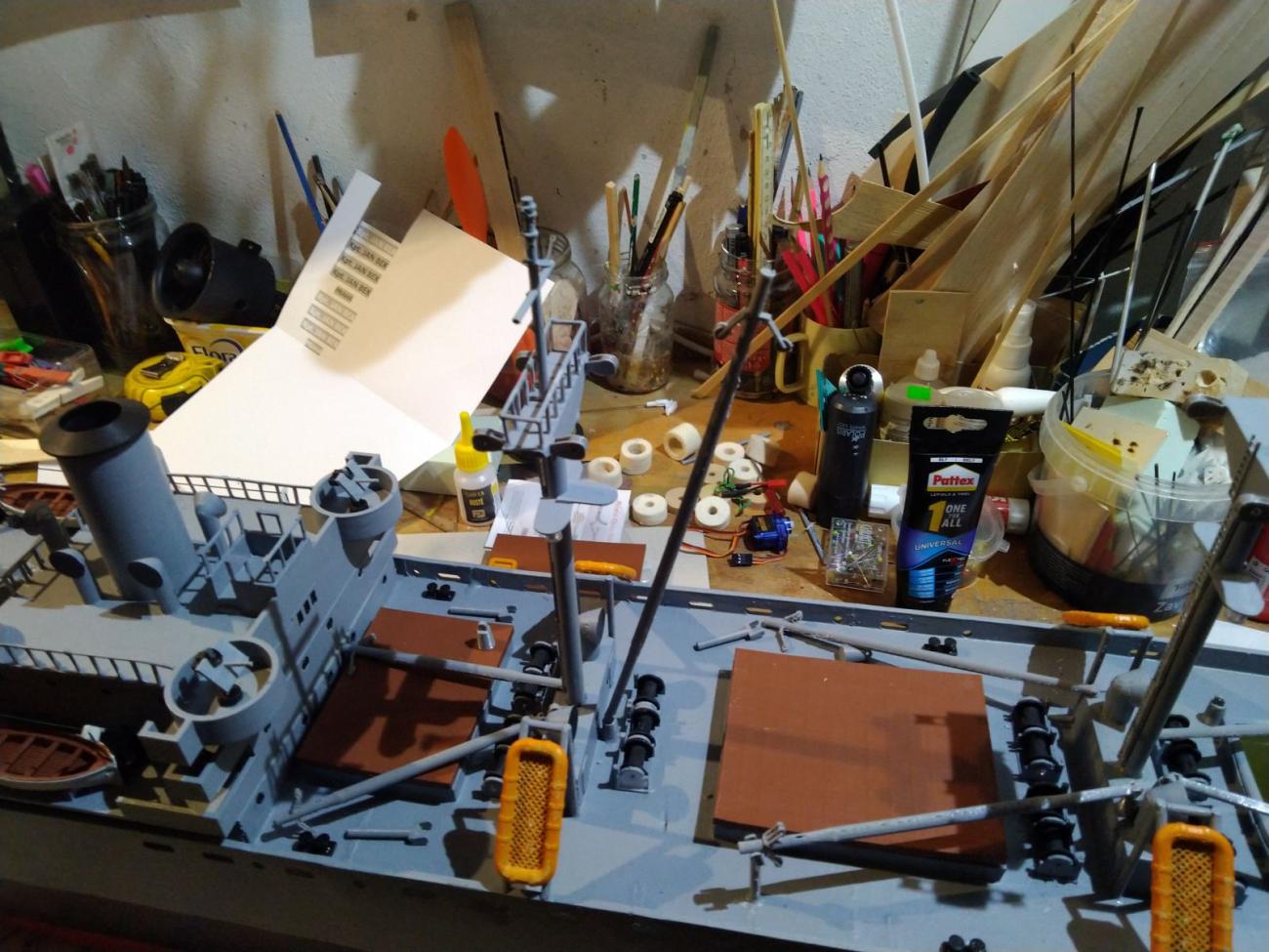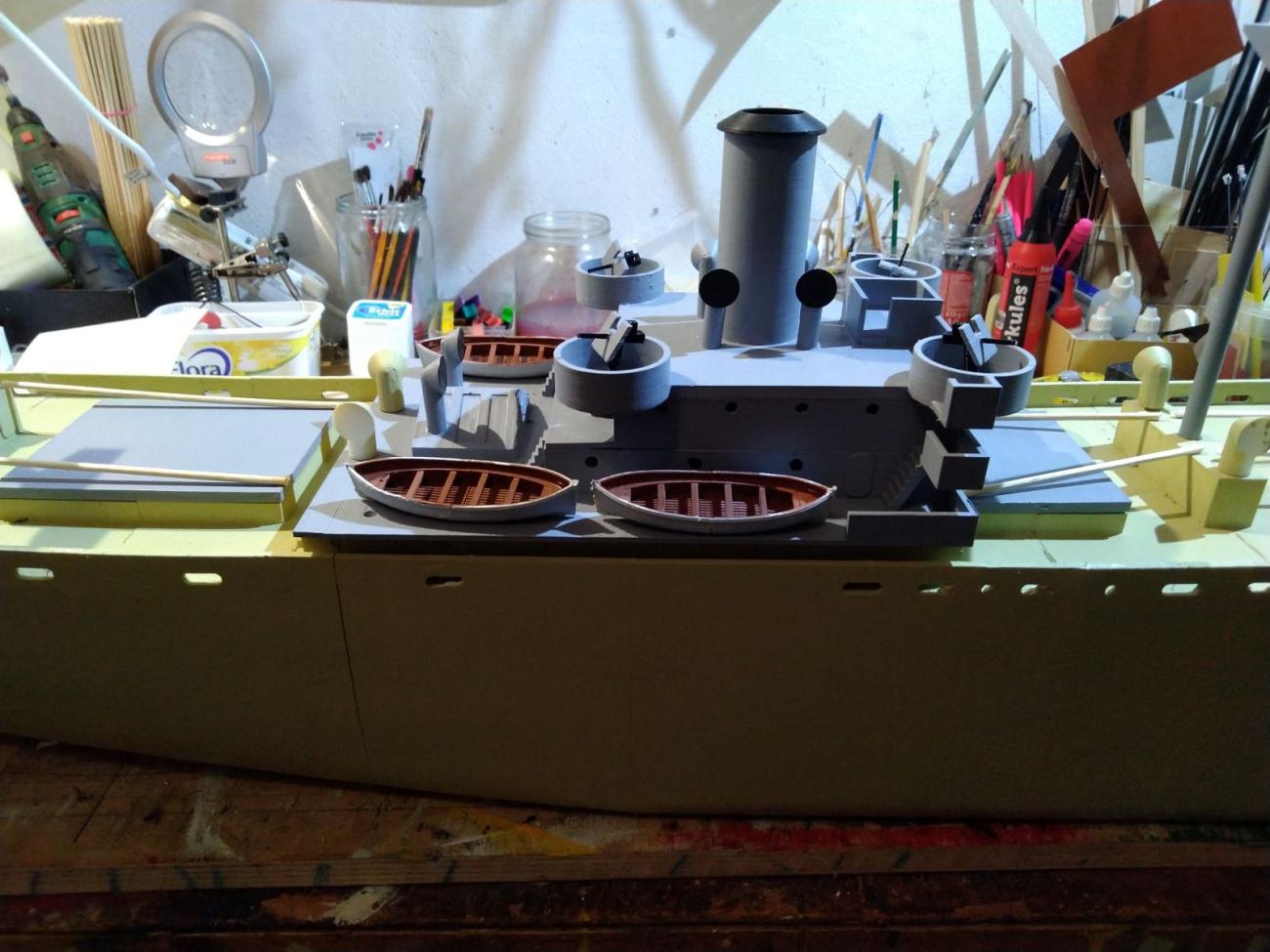 Na člunové palubě jsou čtyři záchranné čluny, po dvou na každé burtě. Moc se mi nelíbily. Něco hledání a použil jsem nalezená data pro model člunu z meziválečné osobní lodě. Myslím, že to vůbec nevadí. Čluny a záchranné ostrůvky se moc vzhledově neměnily. Tyto použité modely mají krásně vidět klinkrovou obšívku a lavice na sezení veslařů. Dále jsem vytiskl několik záchranných vorů a nastříkal je oranžovou barvou (měly by být šedé, ale takhle je na vodě vidět o něco lépe), a rozmístil je různě po modelu, kde si myslím, že by je tenkrát konstruktéři nebo posádka rozmístili. Tyto lodě měly stanoviště kormidelníka schované v horním patře nástavby, bylo nad ním na takzvaném pelingáči stanoviště hlídek a službu konajících námořníků a důstojníků. Toto stanoviště jsem opatřil lehkou stříškou. Následovalo osazení palubních kanonů.