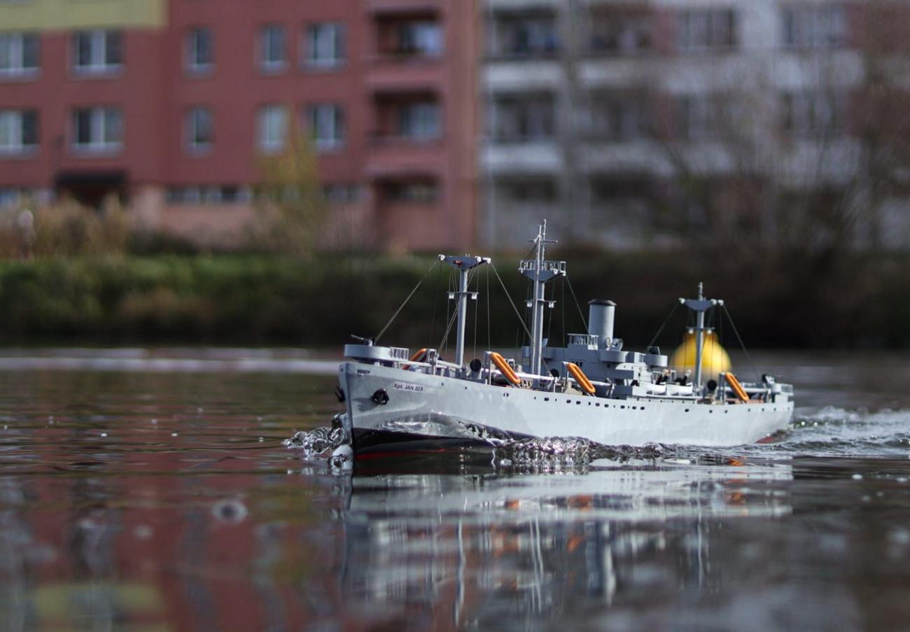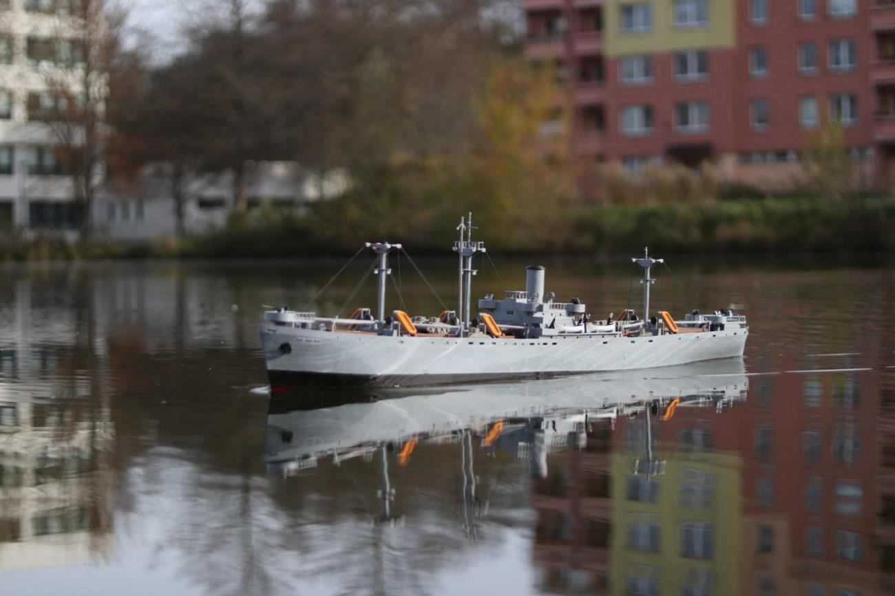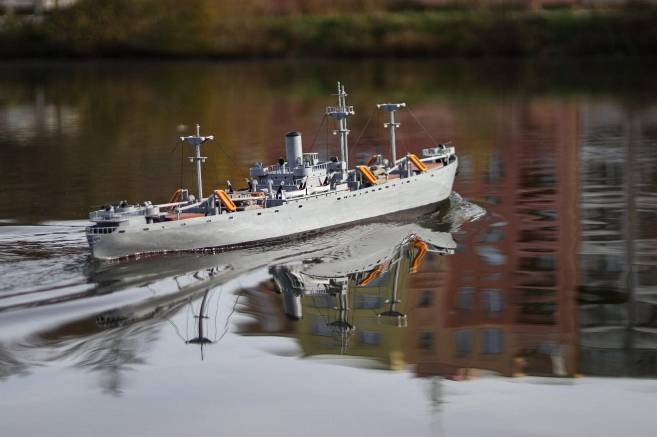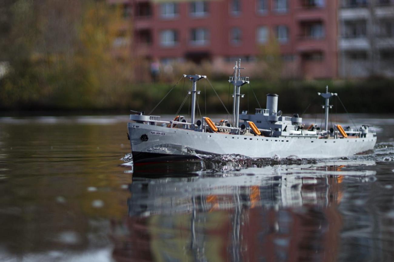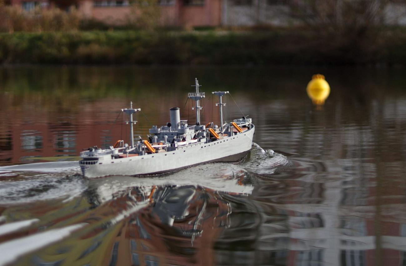 Po těchto stavebních krocích jsem musel loď vyzkoušet. První plavba proběhla na malém schovaném rybníčku u nás ve městě. K mojí škodě jsem tam byl sám. Fotit a kormidlovat mi dohromady moc nešlo. Při této zkoušce ještě byla osazena vrtule o průměru 40 mm od Graupnera. Elektromotor byl bez problému, stejně tak regulátor a zdroj, olověná gelovka 6 V/5 Ah. Plavba vpřed a obraty tak jak by mohl druhoválečný nákladní parník mít. Byl jsem nadšen, jako skutečná, jen při reverzu je graupnerka slabší. Momentálně má model tištěnou, čtyřlistou vrtuli. Couvání je sní o dost lepší.