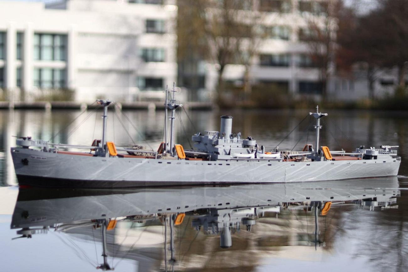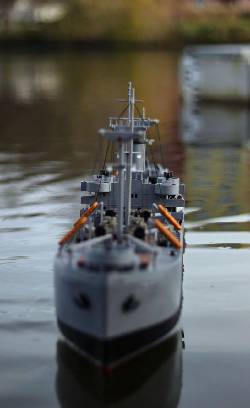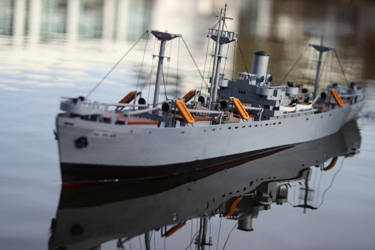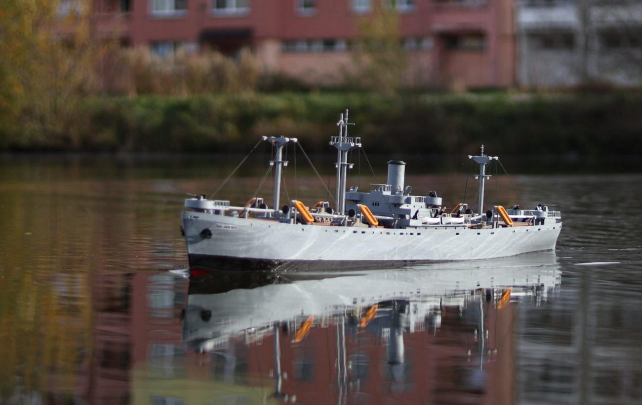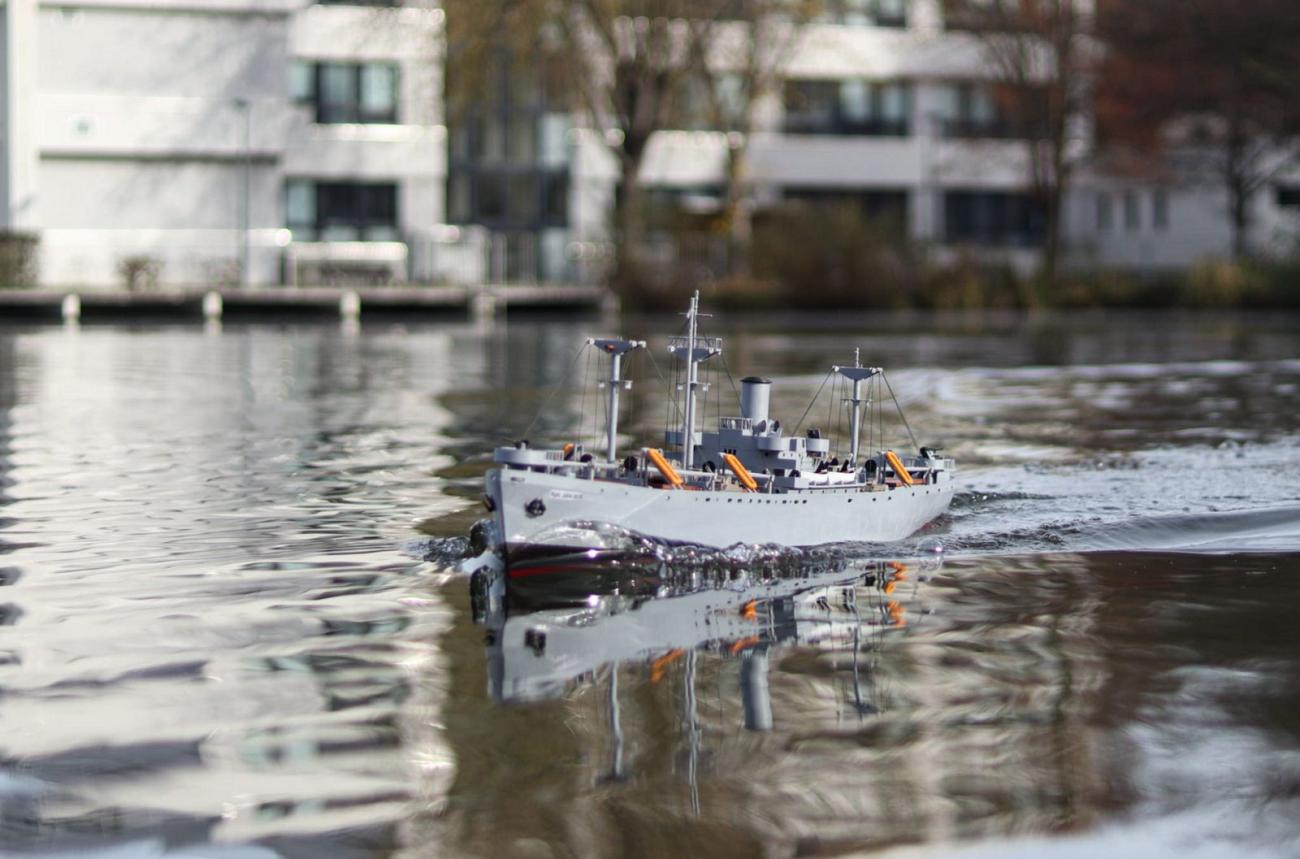 Po těchto stavebních krocích jsem musel loď vyzkoušet. První plavba proběhla na malém schovaném rybníčku u nás ve městě. K mojí škodě jsem tam byl sám. Fotit a kormidlovat mi dohromady moc nešlo. Při této zkoušce ještě byla osazena vrtule o průměru 40 mm od Graupnera. Elektromotor byl bez problému, stejně tak regulátor a zdroj, olověná gelovka 6 V/5 Ah. Plavba vpřed a obraty tak jak by mohl druhoválečný nákladní parník mít. Byl jsem nadšen, jako skutečná, jen při reverzu je graupnerka slabší. Momentálně má model tištěnou, čtyřlistou vrtuli. Couvání je sní o dost lepší.