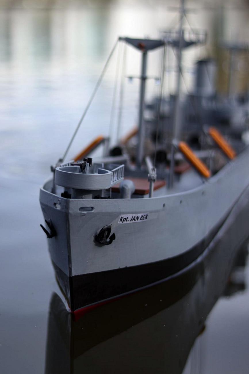 Po broušení, jsem zalepil hřídel s elektromotorem. Přívodní kabely jsem též naletoval předem. Díky připravenému původnímu loži motoru ač je po padesátiprocentním zvětšení, je instalace do osy snadná. Instalace kormidla je jako u jiných obdobných modelů. Osazený trup dostal jednu vrstvu nátěru matné šedé akrylátové barvy. Kormidlo je vytisknuté a je zalepené na ocelové kulatině o průměru 4 mm. Páku jsem měl od MPjet. Hřídel je navlečena do trupu, shora zajištěna pákou a zdola přilepenou patkou s otvorem pro hřídel ke kýlu.