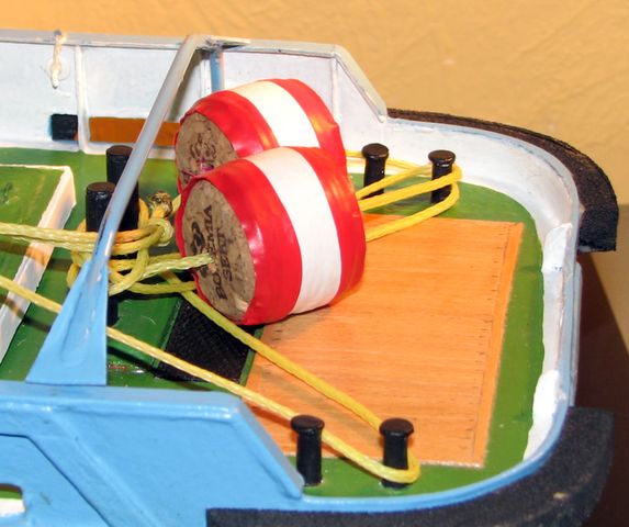 Ikdyž jsou také z papíru, nikterak netrpí, nekroutí se ani nic podobného. Lak kupodivu také nepraská. Drobným nedostatkem se ukázal možný posun přední nástavby v horizontální směru. Při Tug Towingu se při „méně citlivých manévrech“ sama setrvačností posunula. Pád do vody naštěstí taky nikdy nenastal. Nelíbilo se mi to a tak jsem na límec kolem vstupního otvoru v palubě z vnitřní strany nalepil dvě zarážky, které nástavbu již spolehlivě drží na místě. Úprava je to jednoduchá a rychlá.