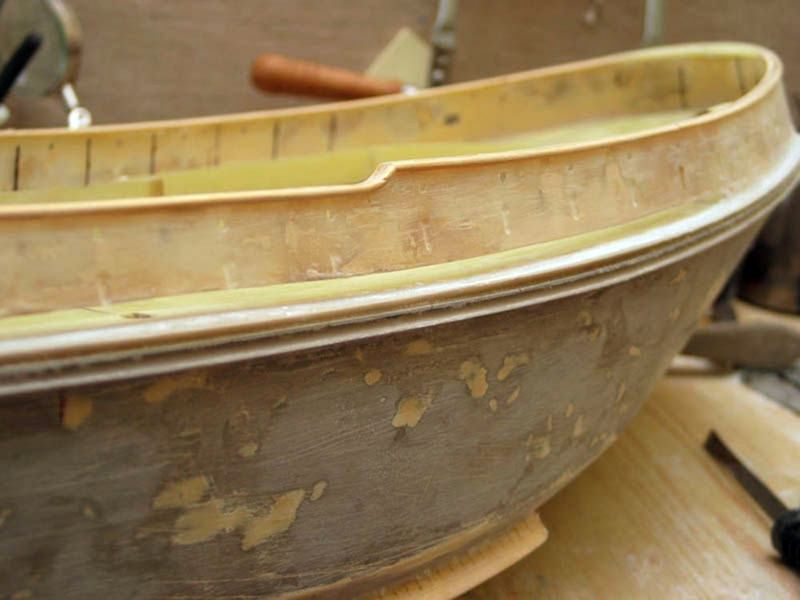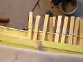 bortu. Použil jsem bambusové špejle z rolet. Pomocí přípravku jsem je obrousil tak, abych dostal nosník o půlkulatém profilu. Ten jsem pak nalepil okolo bortu. Probrousil jsem otvory