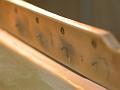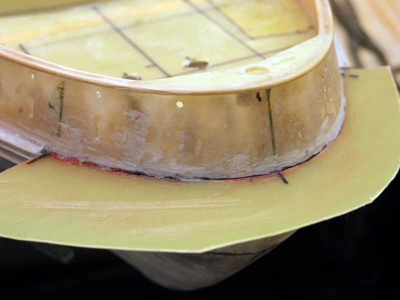 jsem si udělal jednoduchý přípravek, který mě zajistil stejnou výšku otvorů i ok. Z vnějšku bortu jsem pak vyfrézoval otvor pro zajištění oka. Pokračoval jsem následně lemováním