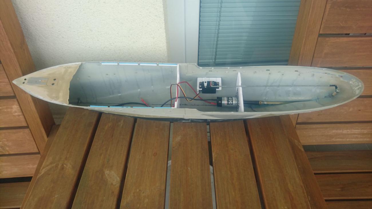 O vytahování kotvy se stará malý naviják pro expediční RC auta, měl by mít tah zhruba 3,5 kg, což by mělo stačit. Provázek je reflexní rybářská šňůra, vede původním otvorem v palubě u kotevního vrátku a pak řetězovým skluzem směrem ven. Ve chvíli, kdy pojedu kotvit, si pak přidělám na malou karabinku kotvu-olovo a dopluji na místo určení. Loď sice bude mít v té chvíli trochu nepříjemné plavební vlastnosti, beru to ale jako daň za takový systém kotvení. Nevylučuji, že to někdy v budoucnu nepředělám.