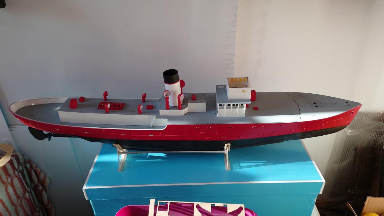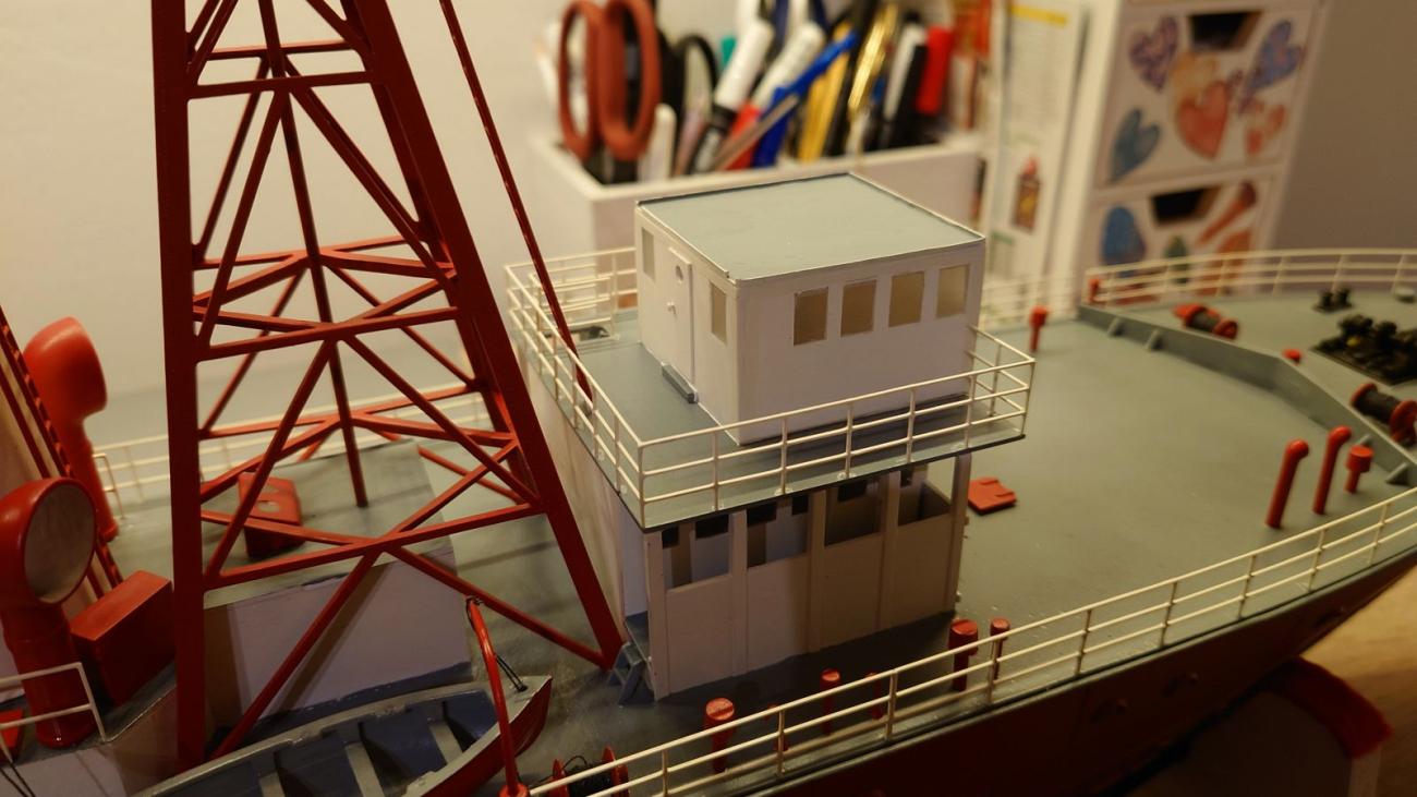 Práce na palubě měly za úkol zbavit loď všech zbraňových platforem a také zjednodušit můstek tak, aby působil více civilně. Nechtěl jsem jej pracně přestavovat, proto hlavně zmizely křídla s pozicemi pro Oerlikony, stejně tak i pracoviště obsluhy Asdicu. Můstek dostal jednoduché zastřešení.