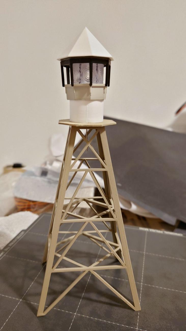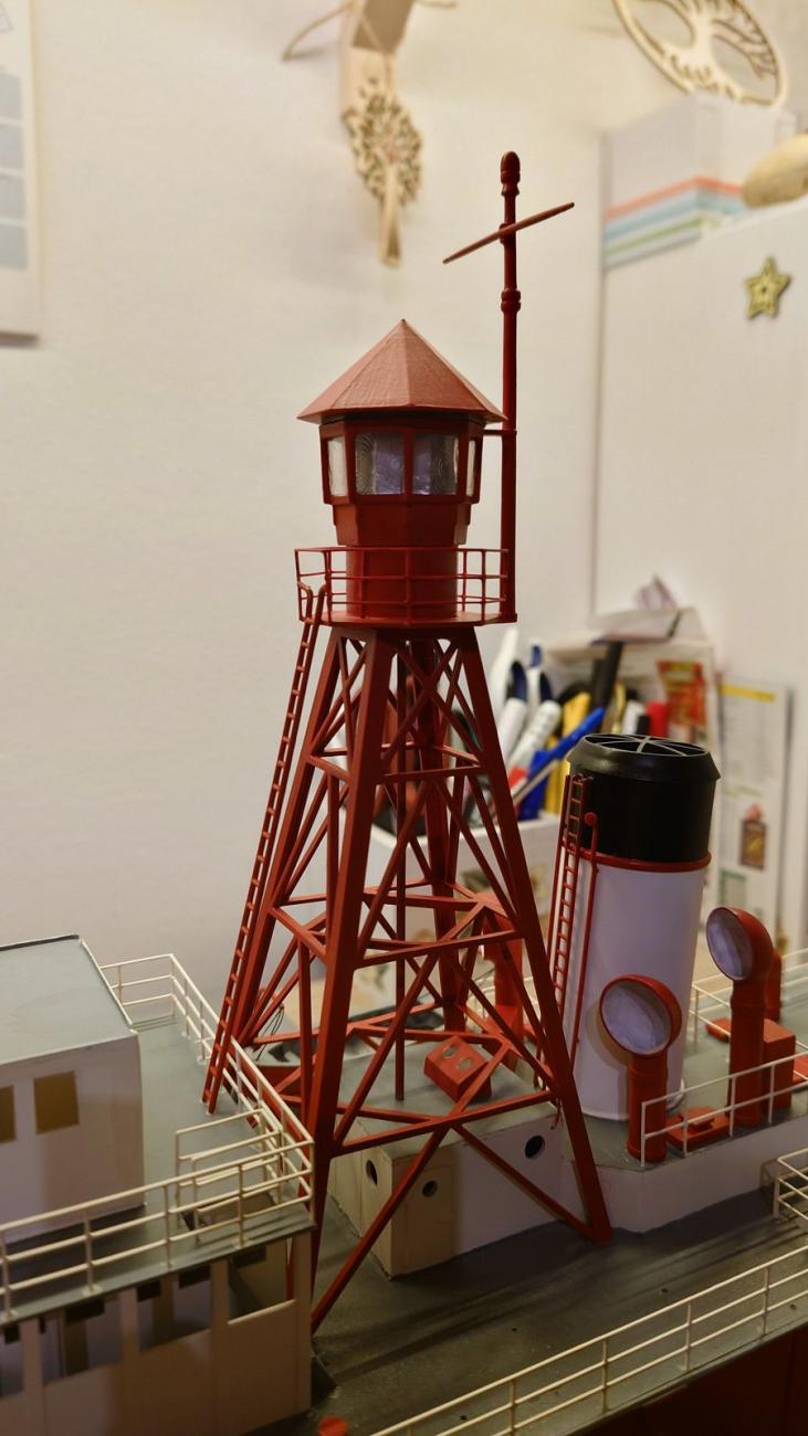 Největší práci v plánování a výrobě pak dostala samotná majáková věž. Na internetu jsem prohlédl mnoho fotek různých majákových lodí, sledoval jsem, co mají na palubě a jak jsou vytvořeny věže s lucernou. Výsledek je, že u každé přestavby bylo použito, co koho napadlo – někde jsou věže jen jako silnější válcová trubka, někde je lucerna umístěna na jednoduché trubkové konstrukci ve tvaru jehlanu, jinde to je příhradová konstrukce. Použil jsem tedy něco mezi, příhradovou konstrukci inspirovanou sloupy velmi vysokého napětí. Tyto konstrukce se velice dobře modelují a jelikož se snažím učit malovat ve 3D a pak i tisknout, použil jsem tuto technologii výroby.