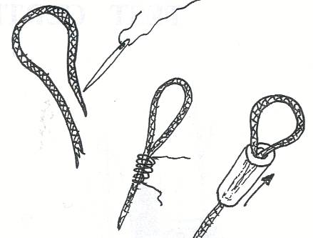Na konci tažného lana vytvoříme smyčku (oko) cca 50 mm dlouhou. V tomto případě jsou uzly nepřijatelné a oplétané lanko se nehodí pro zaplétání. Proto navrhujeme následující postup. V délce asi 25 mm šikmo seřízněte konec lana. Seříznutý konec lana přišijte nebo přilepte vteřinovým lepidlem k lanu. Tím vytvoříte smyčku. Spoj omotejte nití a omotávku lehce potřete vteřinovým lepidlem. Na zajištštění oka na lanu lze použít kousek plastikové trubičky - viz obrázek.