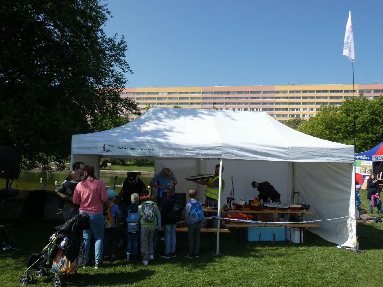 Jak bývá zvykem, stan nám zajistila pořádající Městská část Praha 9, rovněž i nějaká místa k parkování, zásuvku a několik stolů a lavice. Další stolky jsem přivezl já a přišly vhod, stejně jako křesílka u vody, do které jsme společnými silami dali několik překážek, aby ježdění nebylo příliš fádní.