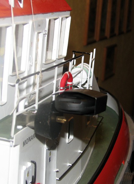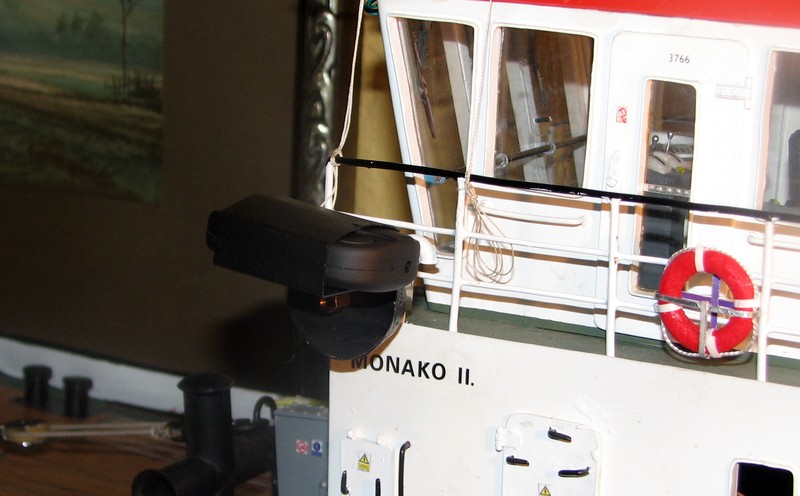 Zpočátku jsem uvažoval o tom, že minikamera bude instalována jen na remorkéru Monaku II., ale to mi přišlo jako velké omezení využití minikamery. Po mnoha pokusech jsem se vyrobil jednoduchý držák (stativ), který by umožňuje kameru snadno připnout k modelu bez jeho poškození. Držák je nastavitelný ve všech třech rovinách a tak je prakticky možné minikameru nasměrovat libovolným způsobem. Aby byla manipulace s kamerou co nejsnažší, stačí ji do držáku jen nasunout a opětovně snadno vyjmout, připojit k PC, stáhnout snímky a opět natáčet.