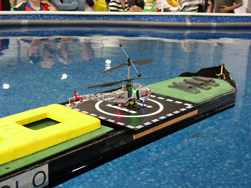 a přistávající na heliportu, přilepeném na vleku pro tug towing. Při jednom z prvních letů u stropu