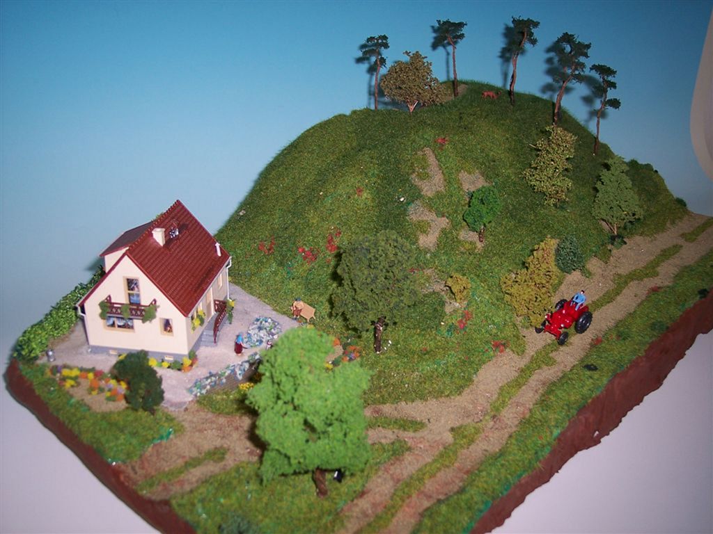 Jednodušší krajinka má rozměr 25 x 15 cm. Její součástí je jednoduchý domek. Chodníčky jsou vysypány štěrkem a na trávníky je použita statická tráva. Malí modeláři pak tvoří květinové záhony a tvarují živé ploty.