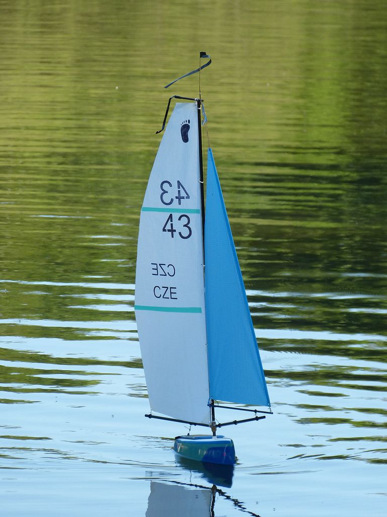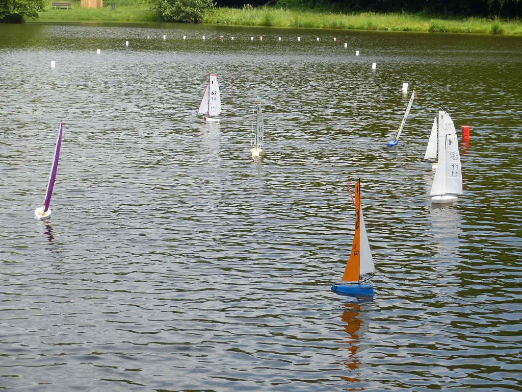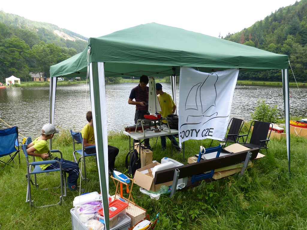 Do auta jsem naložil plachetnic Footy. Sice bych našel i nějaký model pro F4A, ale nechtěl jsem si to komplikovat. Celkem bylo k vidění 20 plachetnic Footy – 10 jezdilo na juniorské trati a 10 na seniorské vždy ve chvíli, kdy se na opačném břehu přírodního koupaliště proháněly rychlé modely sekce M. Během celého víkendu jsme si tak dopřáli 26 jízd, junioři stihli o jednu méně.