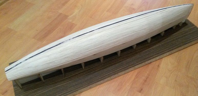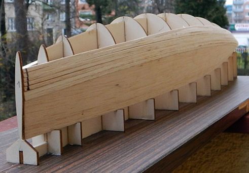 Po slepení konstrukce z březové překližky tl. 3 mm došlo na obšívku z 3mm balzy. Nejprve boky z plátů balzy, která šla překroutit do tvaru i bez namáčení.