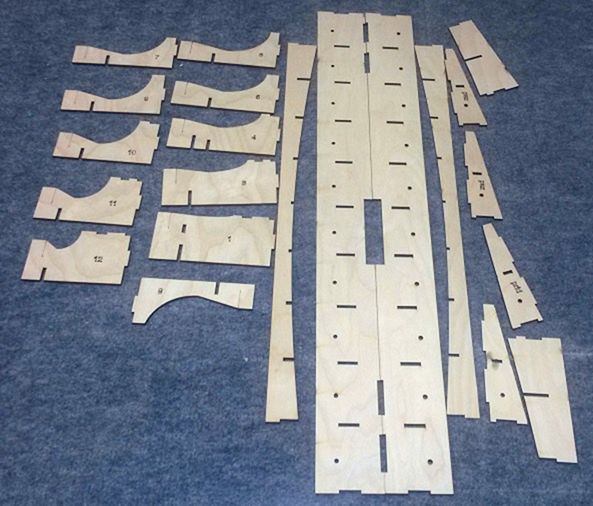 V trupu je místa „jako v hodinkách”, tak před lepením paluby musíme vložit desku serva kormidla a celý středový prvek. Potom stále ve vnější konstrukci budeme lepit palubu. Zmíněná vnější konstrukce je připravená tak, že umožňuje vložení kýlu do pouzdra a také stěžně (uhlíkové trubky). To vše opět pro kontrolu správného ustavení. Paluba je z plastu tl. 1 mm. Po zalepení paluby demontujeme vnější konstrukci, trup již je dostatečně tuhý.