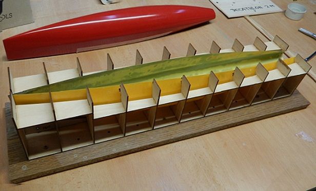 . Je to daň snaze docílit co nejnižší váhu, náš trup má necelých 60 g. Musíme tedy řešit dříve neznámý problém, jak zajistit osazení trupu dalšími prvky bez zdeformování jeho tvaru. Spoléhat na genialitu a slepení všeho od oka v ruce nechceme, tak Honza usedá k PC a s využitím dat trupu kreslí dělenou vnější konstrukci. Do takto vytvořené vnější konstrukce laminátovou skořepinu musíme přesně ustavit, k tomu využíváme hrany trupu, pro kontrolu i průběh hrany mezi boky a dnem. Jde o poměrně zdlouhavou práci, při které si pomáháme pomocnými příčníky a také vnitřními žebry. Jakmile jsme spokojeni s ustavením trupu, tak lepíme na boky balzové pomocné lišty, na jejichž horní hranu přijde přilepit paluba. Ve vnitřních žebrech jsou vyříznuté dorazy a tak postupně na oba boky lišty přilepíme. Také vlepíme na svoje místo balzové příďové a záďové žebro. Po dokončení trupu bude záď šikmo seříznutá podobně jako na předchozích typech.